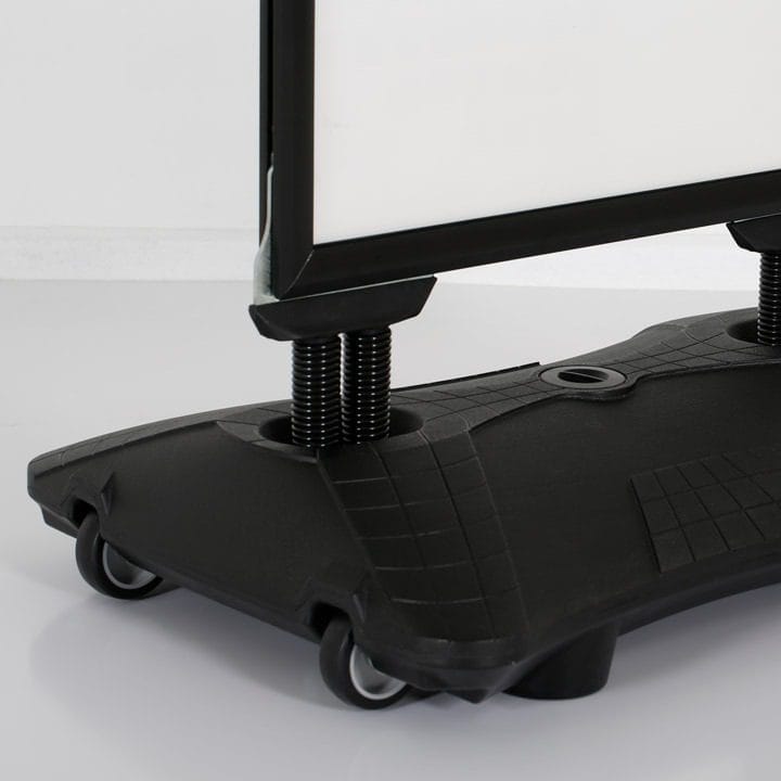 Durch die intelligente Konstruktion auf beweglichen Stahlfedern kann sich der Kundenstopper WindPro Plus den Windböen anpassen. Der spezielle Kunststoff-Fuß mit integrierten Laufrollen macht ihn besonders geeignet für windige Umgebungen. Die Füllung mit Sand wird empfohlen, da er fast doppelt so schwer wie Wasser ist.