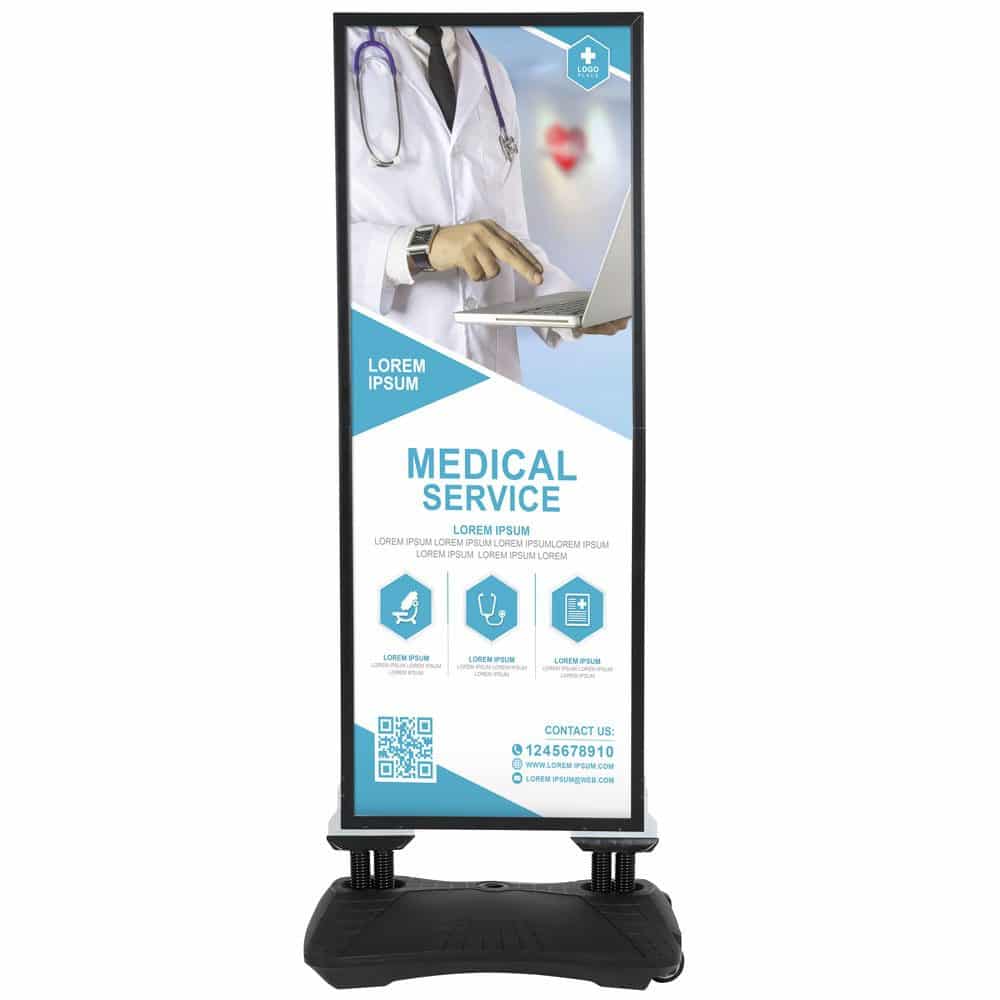 Der Outdoor Kundenstopper Slim ist mit einem erstklassigen, rostfreien Rahmen ausgestattet, der Stabilität und Haltbarkeit gewährleistet. Dadurch bleibt Ihre Werbebotschaft fest an Ort und Stelle, selbst in herausfordernden Umgebungen.
