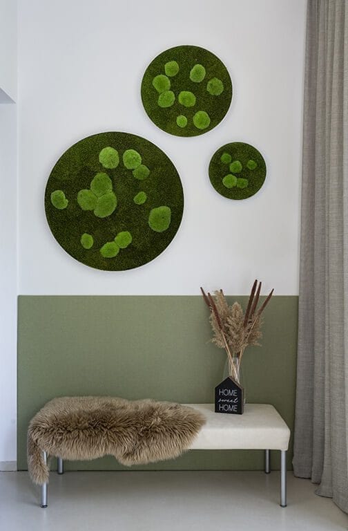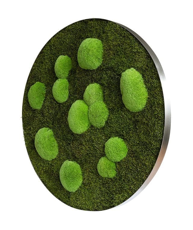 Bringen Sie mit dem Moosbild Wald- und Kugelmoos Kreis 80cm die Natur in Ihr Zuhause und genießen Sie eine lebendige und pflegeleichte Dekoration, die Ihre Räume auf einzigartige Weise aufwertet.