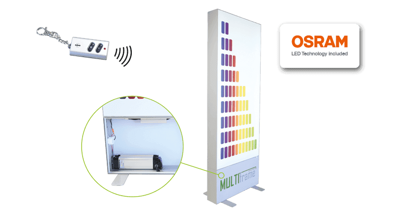 Der multi frame SL Battery LED Leuchtrahmen bietet eine innovative Lösung für Situationen, in denen ein Stromanschluss fehlt oder das Verlegen von Kabeln unpraktikabel ist. Erhältlich in zwei Standardformaten (80 x 222 cm und 100 x 222 cm) ist dieser doppelseitige Leuchtrahmen vielseitig einsetzbar und ideal für Messen, Events oder Präsentationen geeignet.
