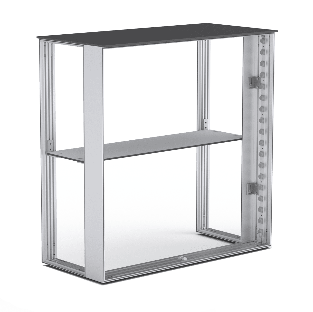 Mit einem Gewicht von ca. 30 kg (ohne Druck) ist der Counter One trotz seiner Größe leicht zu transportieren. Die einfache Montage mit einem Aufstellmaß von 100 x 101,5 x 48 cm bietet eine kompakte und dennoch eindrucksvolle Präsentationsfläche.