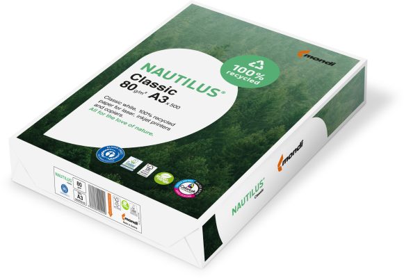 Das NAUTILUS® CLASSIC Papier ist ein hochweisses Recyclingpapier mit einem Helligkeitsgrad von 112 CIE, hergestellt aus 100% FSC-Recycling-Zellstoff. Es zeichnet sich durch hervorragende Laufeigenschaften und eine gute Opazität aus, was ein Durchscheinen verhindert.