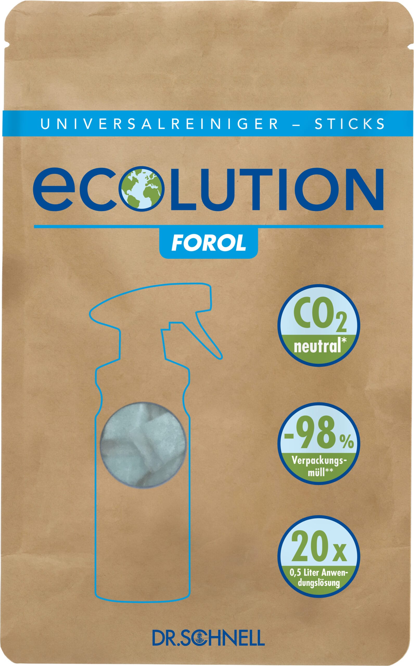 Der ECOLUTION Universalreiniger ermöglicht eine nachhaltige Reinigung dank 3 Gramm ökologischem Granulat in wasserlöslicher Verpackung. Mit den ECOLUTION STICKS können Sie ganz einfach 500 ml Reinigungsmittel selbst herstellen. So leisten Sie einen Beitrag zur Reduzierung des CO2-Ausstosses im Transport und sparen gleichzeitig 98% Verpackungsmüll.