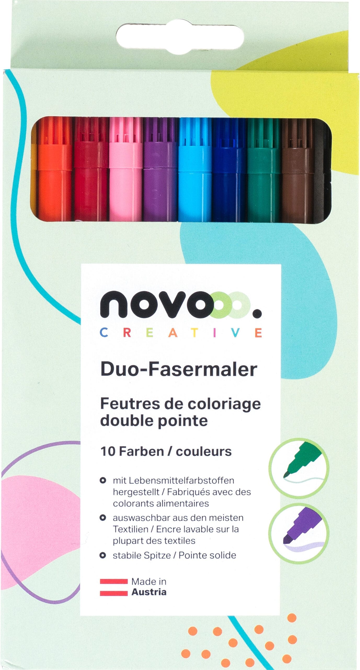 Die Filzstifte von NOVOOO überzeugen nicht nur durch ihre kreativen Möglichkeiten, sondern auch durch ihre Qualität. Hergestellt aus lebensmittelechten Farbstoffen garantieren sie eine unbedenkliche Nutzung für Kinder und Erwachsene gleichermassen.