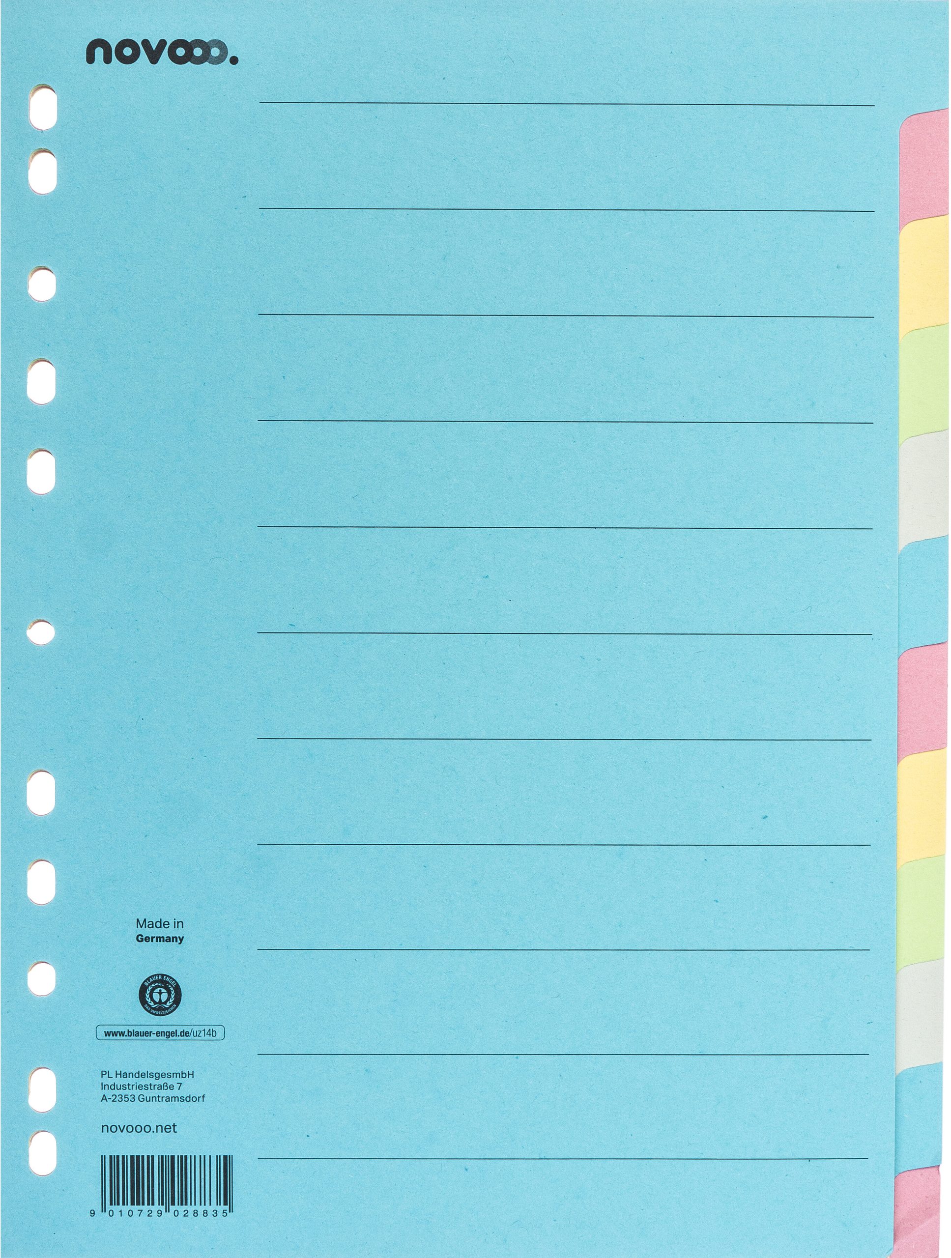 Das NOVOOO Kartonregister ist im DIN A4 Format erhältlich und somit kompatibel mit den meisten gängigen Ordnersystemen. Es passt perfekt in Standard-Ordner und Aktenmappen, was die Integration in Ihre bestehende Büro- oder Schulorganisation erleichtert. Mit diesem vielseitigen Register haben Sie die Möglichkeit, Ihre Ablage individuell zu gestalten und jederzeit anzupassen.