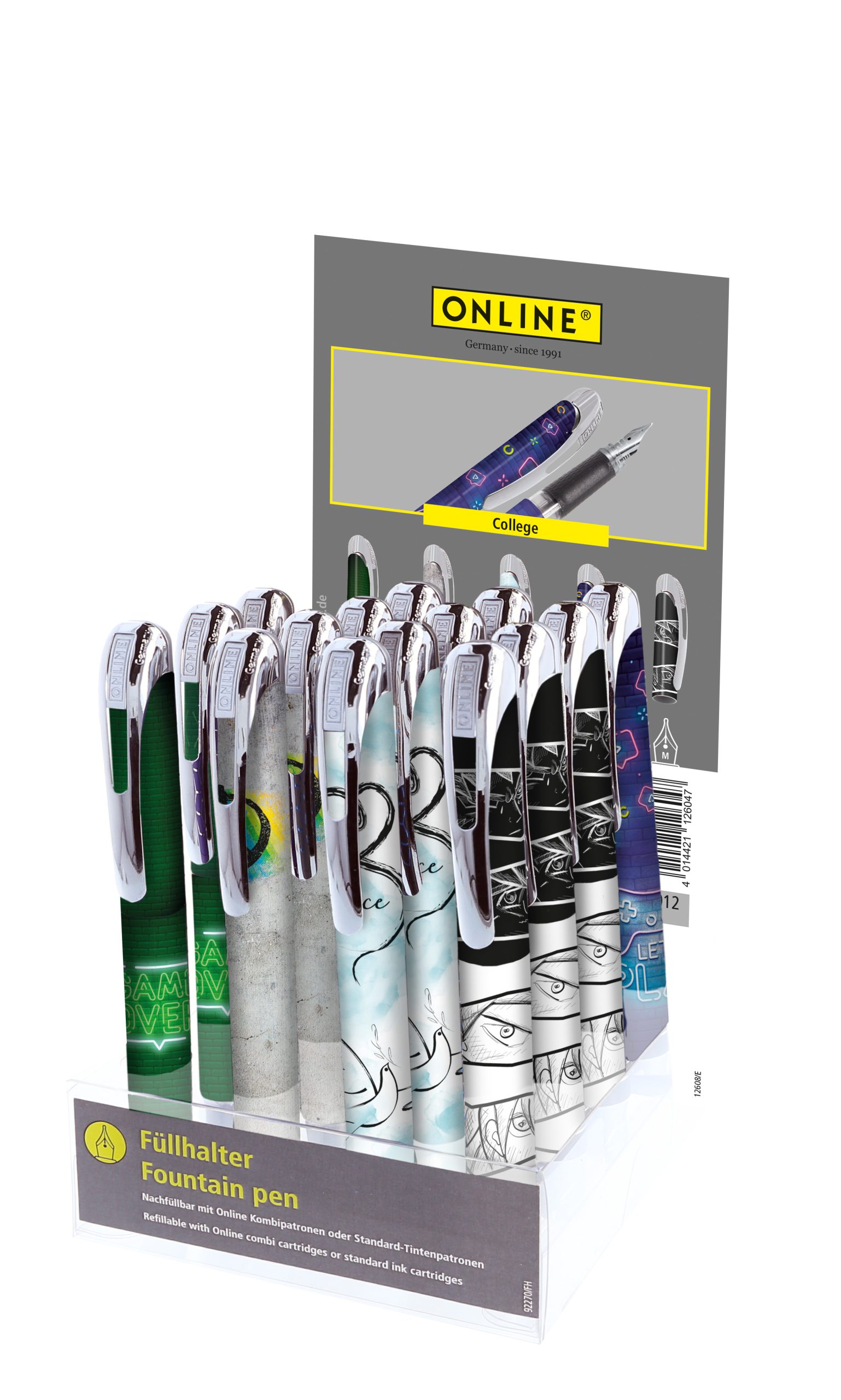 Der ONLINE Display Füllhalter College 12608/15 ist mit STANDARD-Tintenpatronen kompatibel, die in den meisten Schreibwarenläden erhältlich sind. Dies ermöglicht eine einfache Handhabung und sorgt dafür, dass Sie jederzeit in den Genuss eines reibungslosen Schreibflusses kommen. Die Nachfüllung ist unkompliziert und schnell erledigt, sodass Sie stets bereit sind, Ihre Gedanken zu Papier zu bringen.