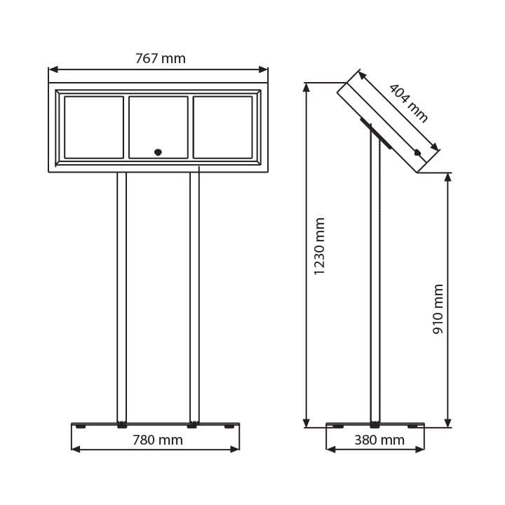 Der Speisekartenständer bietet Platz für bis zu 3 A4 Blätter nebeneinander. Diese großzügige Fläche ermöglicht eine übersichtliche und ansprechende Darstellung von Menüs oder anderen Informationen. Somit können Inhalte klar und strukturiert präsentiert werden, um Kunden optimal anzusprechen.