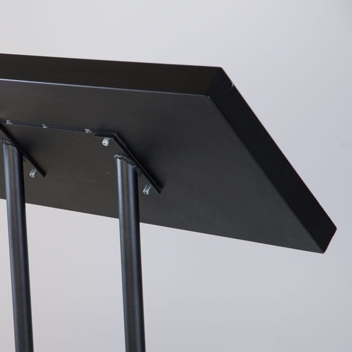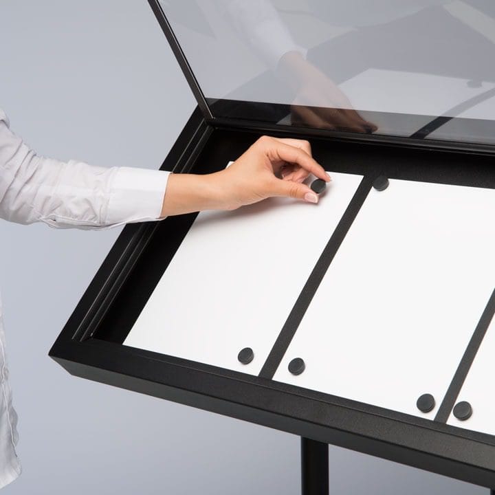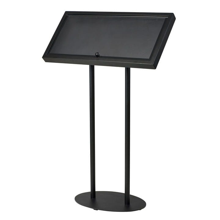 Der Speisekartenständer überzeugt mit einem modernen schwarzen Design, das in verschiedensten Umgebungen eine stilvolle Präsentation ermöglicht. Entwickelt für den Außeneinsatz, bietet er eine praktische Lösung zur Darstellung von Menüs oder anderen Informationen. Die Handhabung ist äußerst einfach und bequem gestaltet.