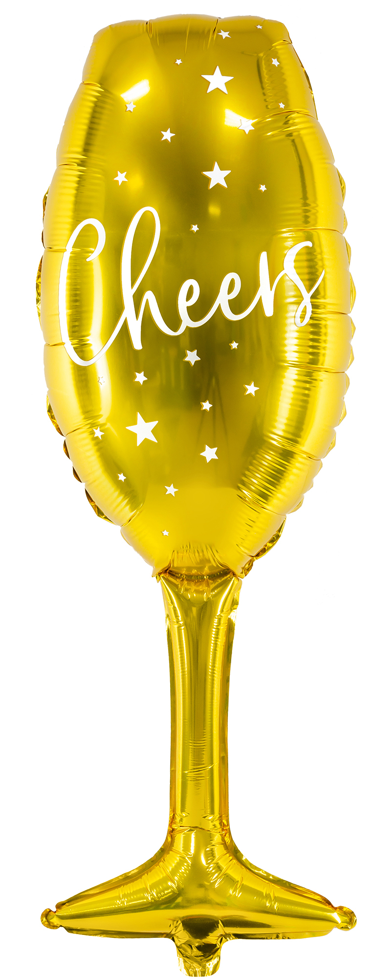 Der metallisierte Folienballon in Form eines Glases setzt mit seinem goldfarbenen Design und der weissen Aufschrift ?Cheers? einen eleganten Akzent bei jeder Feier. Mit seinen Massen von etwa 28 x 80 cm zieht er sofort die Aufmerksamkeit auf sich und eignet sich perfekt als Highlight über dem Getränkebereich, dem Geschenketisch oder als originelles Fotomotiv. Die glänzende Oberfläche sorgt für eine festliche Wirkung und verleiht dem Ambiente eine stilvolle Note.