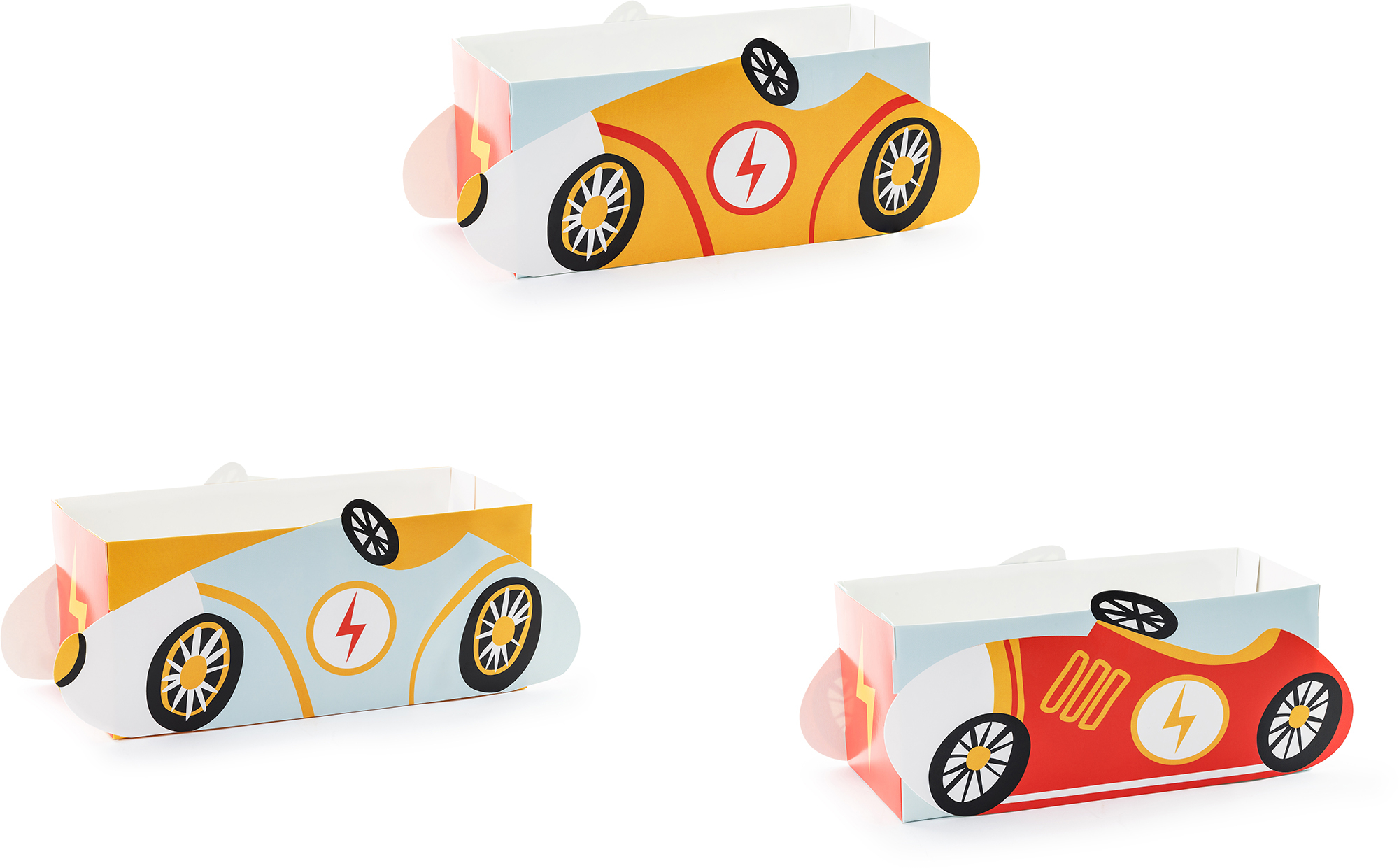 Die Snackboxen im Automotiv bringen Farbe, Bewegung und Kreativität auf jeden Partytisch. Gefertigt aus Papier im lebendigen Farbenmix, werden sie nach der Montage zu dekorativen Boxen mit einer Grösse von etwa 7,5 x 7,5 x 17 cm. Das Set enthält 3 Boxen sowie 6 zusätzliche Papier-Elemente, die individuell angebracht werden können, um jedem Fahrzeug einen eigenen Charakter zu verleihen. Als DIY-Produkt laden sie zum Mitmachen ein und machen bereits beim Zusammenbauen Spass ? perfekt für kleine Rennfahrer und kreative Kinderhände. Ob für Popcorn, Süssigkeiten oder kleine Snacks: Die Boxen sind nicht nur praktisch, sondern auch ein originelles Partyhighlight, das den Tisch in eine farbenfrohe Strasse verwandelt. In jeder Verpackungseinheit sind 3 Stück enthalten.