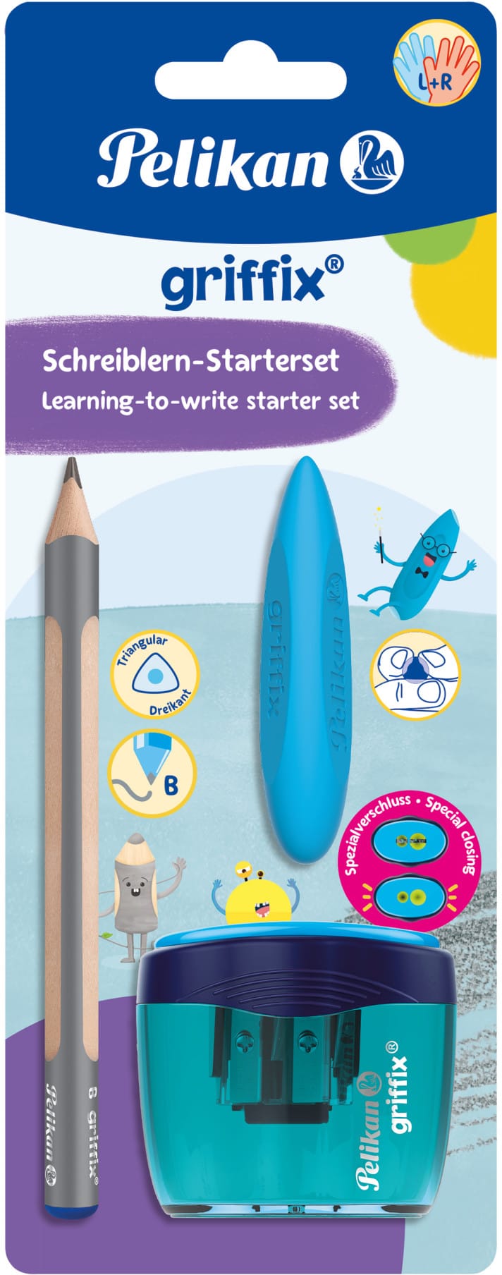 Das griffix Starter-Schreibset ist die ideale Wahl für Kinder, die gerade das Schreiben lernen. Es besteht aus einem ergonomischen Radiergummi, einem Doppeldosenanspitzer und einem holzgefassten Schreiblernbleistift der Härte B.