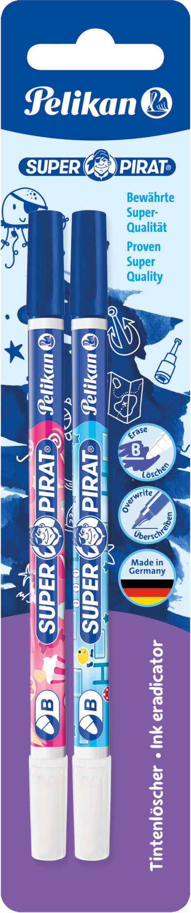 Der PELIKAN Tintenlöscher Super Pirat B 850B/2/B ist die ideale Lösung für alle, die beim Schreiben oder Zeichnen mit Tinte arbeiten und gelegentlich Fehler machen. Dieses praktische Set enthält zwei Tintenlöscher, die in einem ansprechenden Blister verpackt sind und sich perfekt für den Einsatz zu Hause, in der Schule oder im Büro eignen. Mit ihrem kindgerechten Design und der auffälligen Piraten-Thematik sind sie besonders bei jungen Nutzern beliebt.