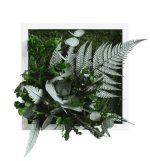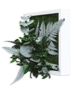 Das Pflanzenbild ist in einen eleganten weißen Vollholzrahmen eingefasst, der in Deutschland hergestellt und FSC-zertifiziert ist. Die Verwendung von 100% natürlichen Pflanzen und Moosen macht dieses Kunstwerk ideal für den Innenbereich.