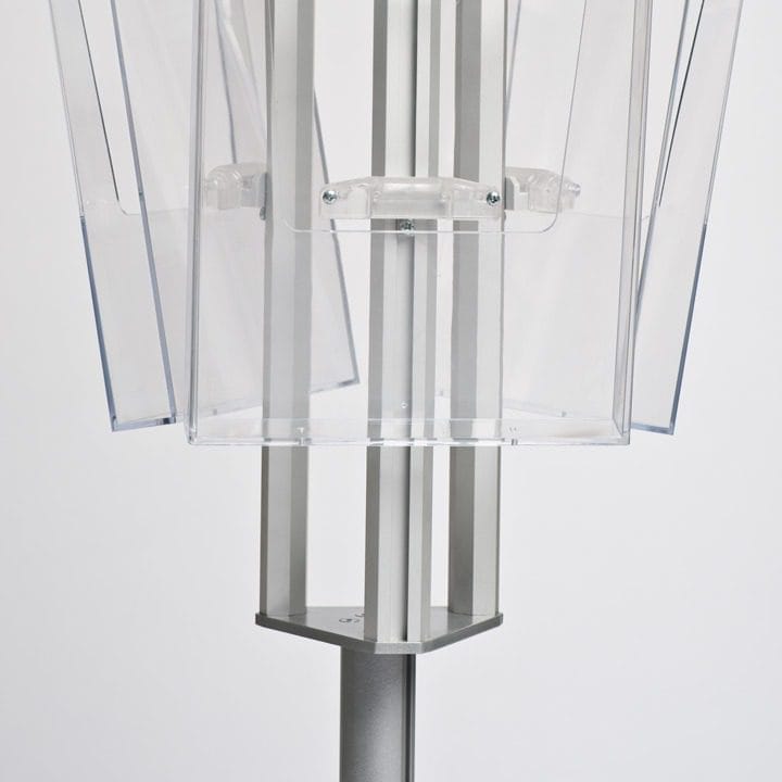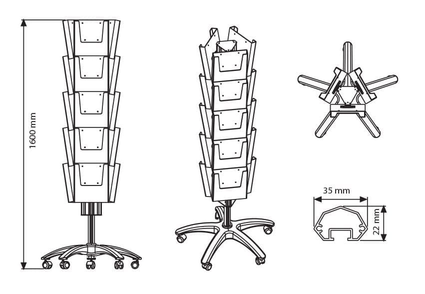 Mit einer Höhe von 1600 mm bietet der Prospektständer eine optimale Sichtbarkeit Ihrer Informationsmaterialien. Trotz seiner beeindruckenden Höhe bleibt er stabil und sicher stehen. Die Stange ist in beiden Größen zum Tragen von fünf Prospekthaltern ausgelegt, was eine gleichmäßige Verteilung und Präsentation der Inhalte gewährleistet.