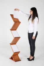 Trotz seiner kompakten Größe beeindruckt der Prospektständer Wood Zick Zack mit seiner Wirkung. Die Maße von L370mm x H1485mm x B220mm machen ihn platzsparend und dennoch bietet er eine beeindruckende Präsentationsfläche. Diese Balance zwischen Größe und Funktionalität macht ihn ideal für Messestände, Events, Ladengeschäfte und mehr.