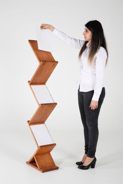 Ein herausragendes Merkmal des Prospektständers Wood Zick Zack ist seine Fähigkeit, von vorne und hinten mit A4-Broschüren bestückt zu werden. Dadurch können Ihre Informationen von verschiedenen Blickwinkeln betrachtet werden, was die Sichtbarkeit erhöht und ein breiteres Publikum anspricht.