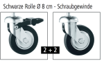 Die Stahlrollen mit einem Durchmesser von 8 cm ermöglichen eine reibungslose Mobilität auf verschiedenen Oberflächen. Zwei Rollen sind mit Bremsen ausgestattet, um die Position des Ständers zu fixieren, während die anderen zwei Rollen ohne Bremsen eine einfache Bewegung ermöglichen, wenn nötig.