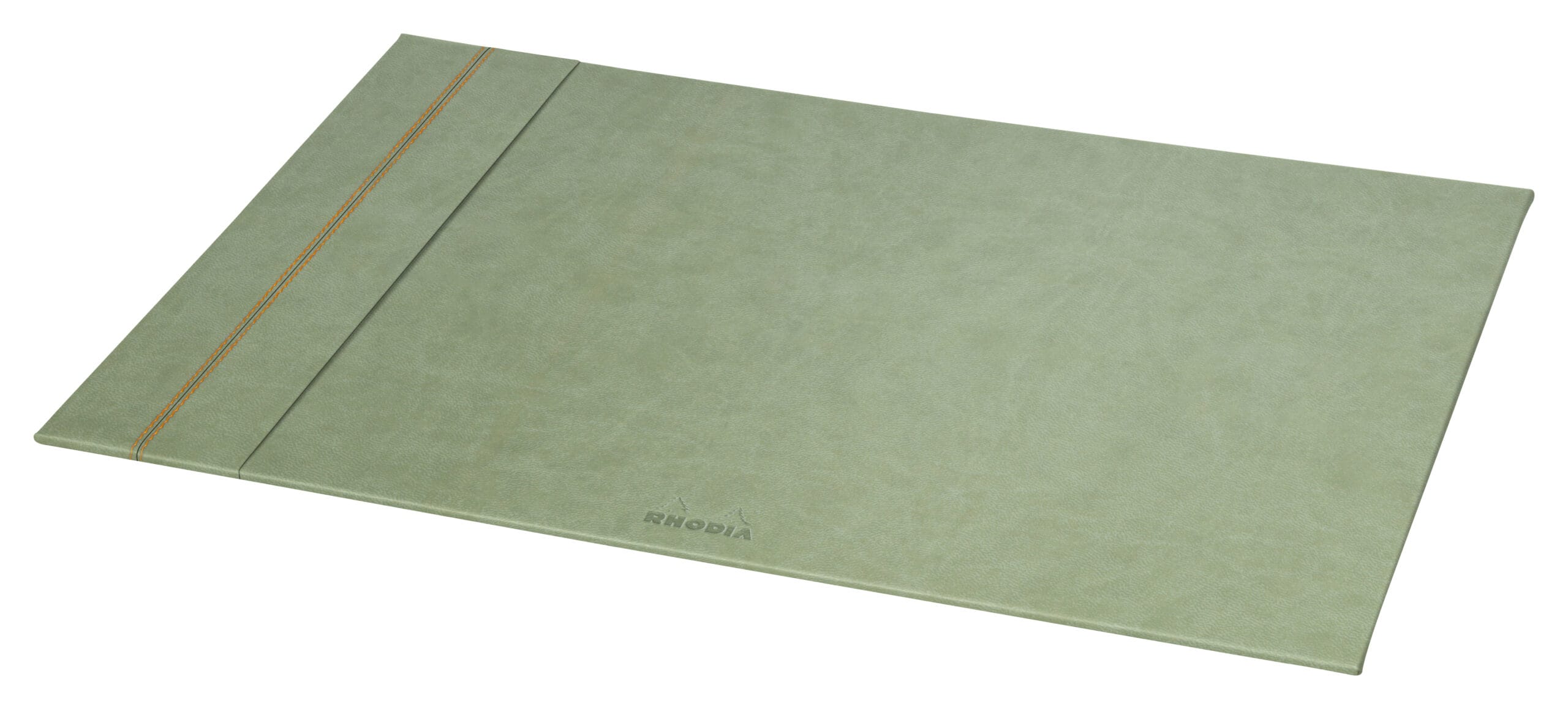 Die Schreibtischunterlage ist aus italienischem Kunstleder gefertigt und besticht durch ihre feste und stabile Struktur. Die Vorderseite ist mit einem geprägten Rhodia-Logo und orangefarbenen Sattlerstichen verziert, was der Unterlage eine edle Optik verleiht.
