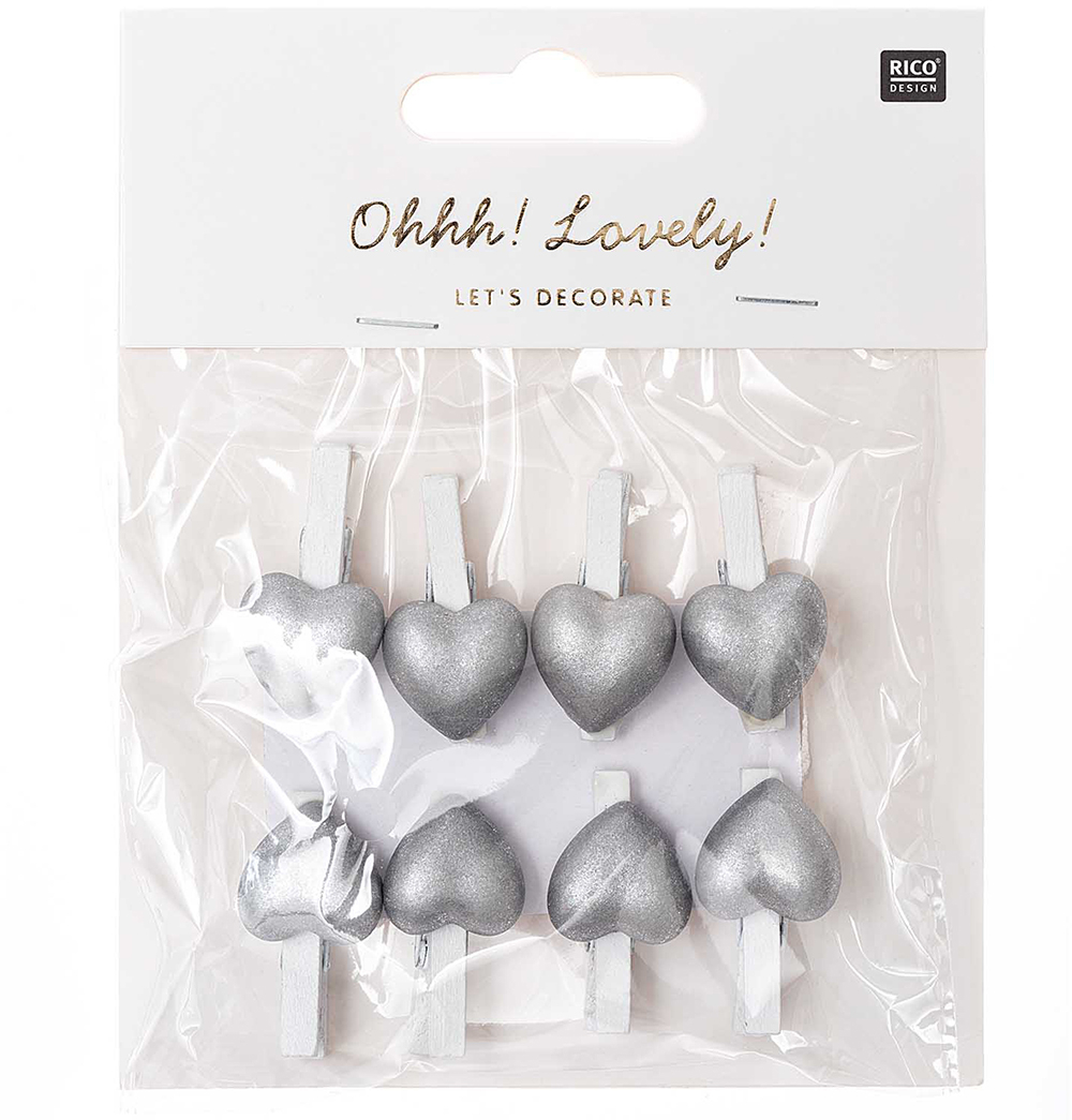 RICO DESIGN Dekoklammern Herz 7040.26.18 weiss-silber, 8 Stück, 3cm