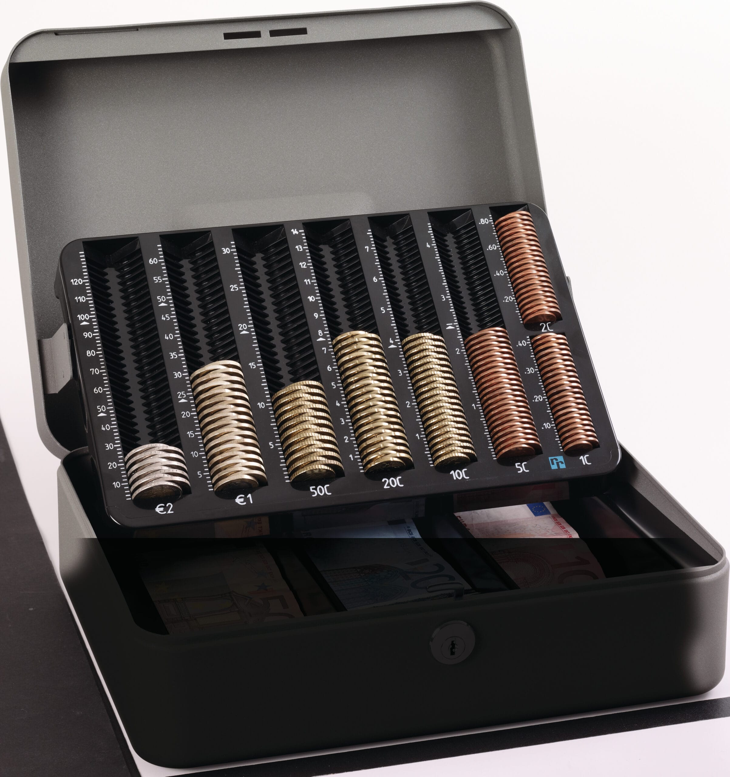 Mit dem ergonomischen Tragegriff lässt sich die Geldkassette bequem transportieren. Der herausnehmbare Münz-Zähleinsatz ermöglicht eine präzise und geordnete Aufbewahrung von Münzen und Scheinen. So behalten Sie jederzeit den Überblick über Ihr Kleingeld.