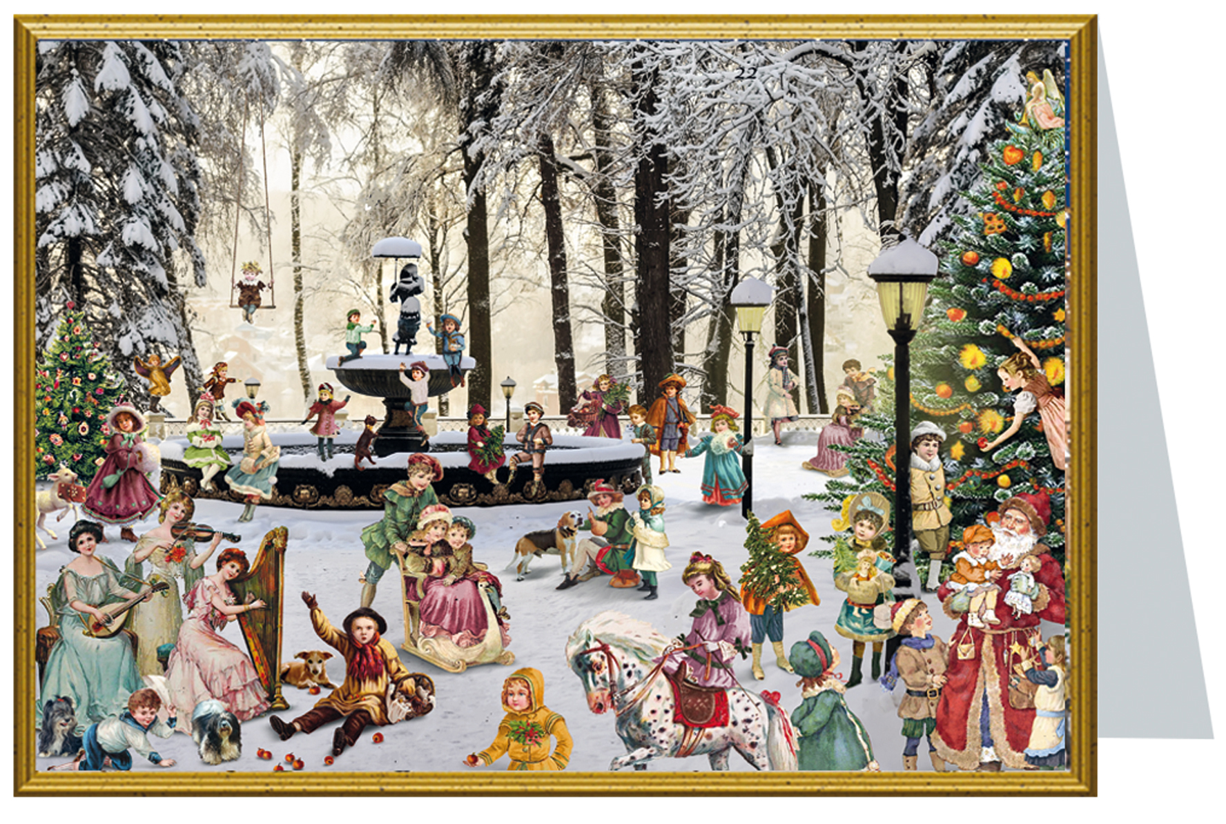 Das wunderschöne Motiv zeigt einen idyllischen Brunnen, umgeben von einer schneebedeckten Landschaft. Die feinen Details und die harmonischen Farben machen diese Karte zu einem echten Hingucker. Jedes Element wurde sorgfältig ausgewählt, um die Magie der Weihnacht festzuhalten und die Vorfreude auf das Fest zu steigern.