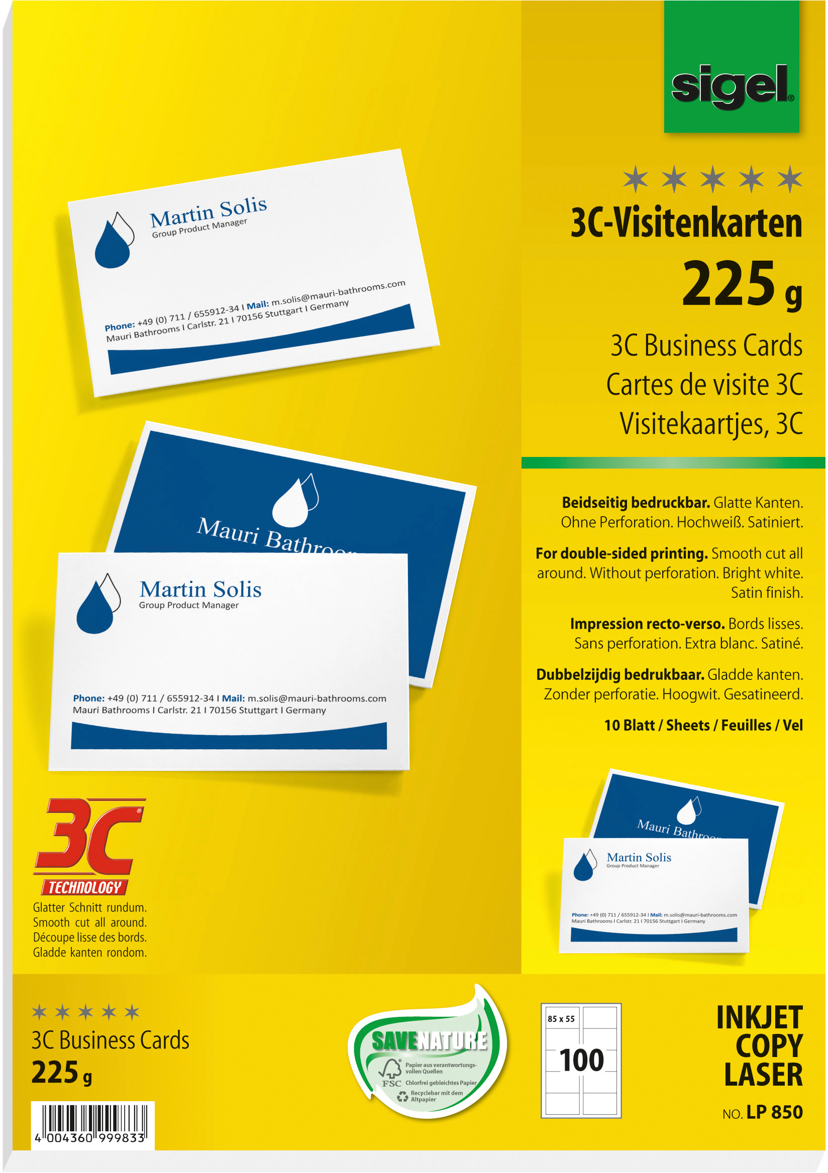 Die Visitenkarten sind mit den gängigen Druckern und Drucktechnologien kompatibel, was eine einfache und schnelle Erstellung Ihrer individuellen Designs ermöglicht. Ob Sie einen Tintenstrahldrucker oder einen Laserdrucker verwenden, die Karten sind für beide Möglichkeiten geeignet. Dies macht die SIGEL Visitenkarten zu einer flexiblen Wahl für alle, die ihre Karten selbst gestalten und drucken möchten.