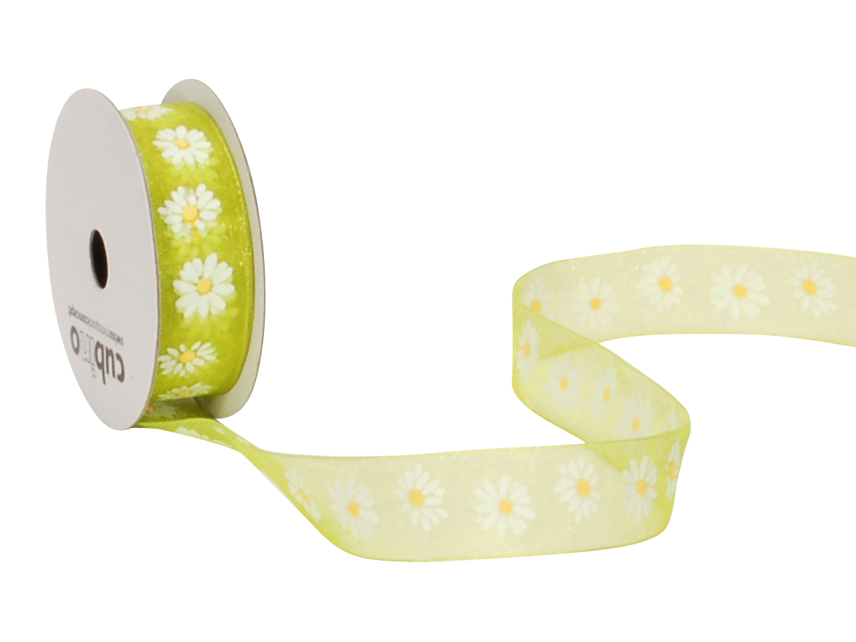 Der SPYK Band Cubino in 15mm x 4m begeistert mit einem frischen grün/weissen Margeriten-Design. Ideal für kreative Bastelprojekte und Dekorationen.
