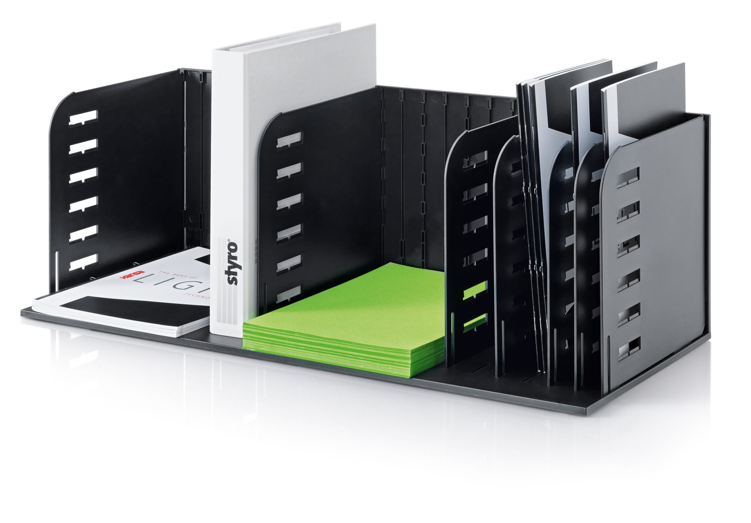 Das Ablagesystem besteht aus hochwertigem, langlebigem Kunststoff, der nicht nur robust ist, sondern auch eine ansprechende Optik bietet. Die matte Oberfläche in Schwarz sorgt dafür, dass das System nicht nur funktional, sondern auch ästhetisch ansprechend ist. Dank der stabilen Konstruktion können Sie sicher sein, dass Ihre Unterlagen optimal geschützt sind und nicht verrutschen.