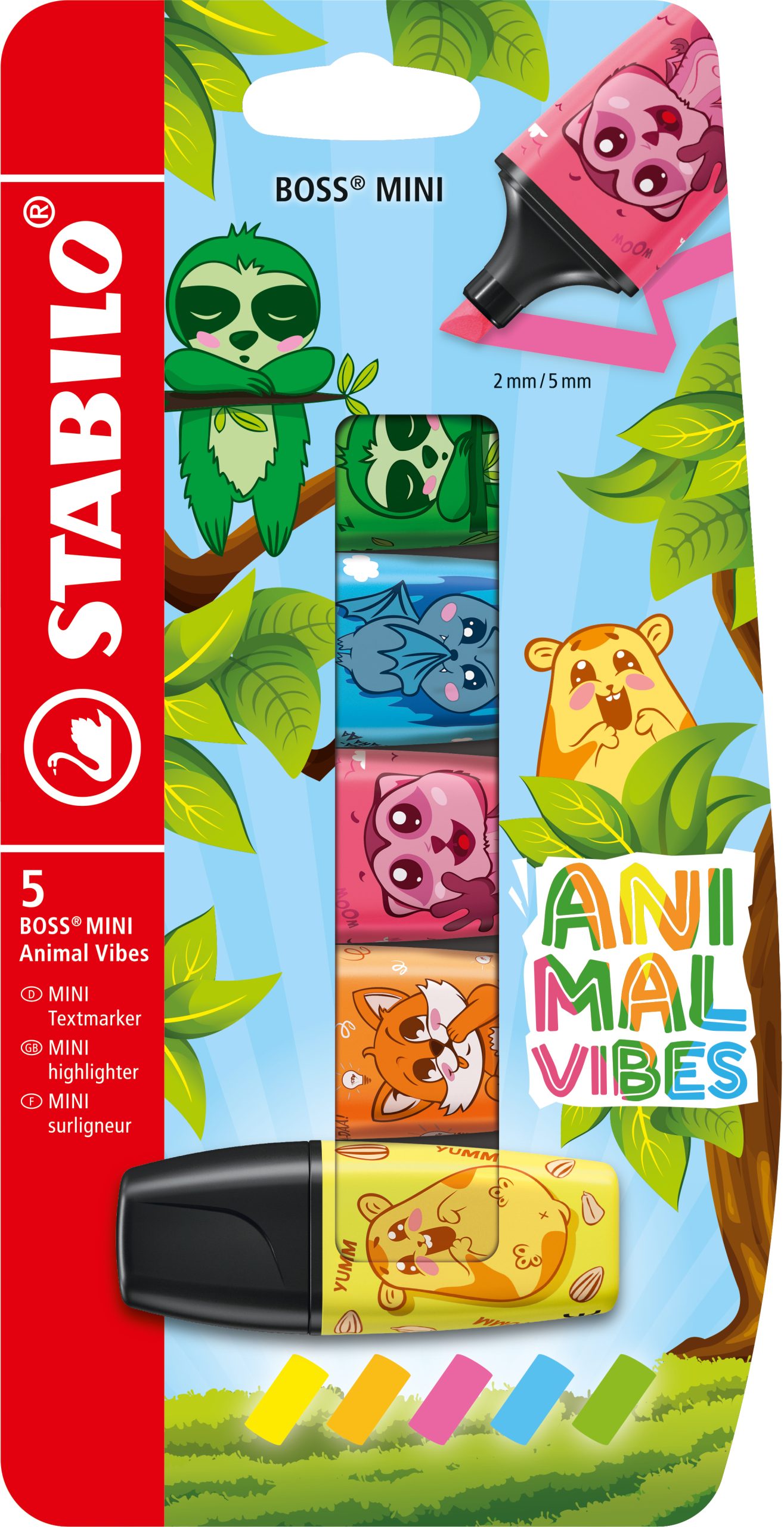 Die STABILO Animal Vibes Kollektion umfasst farbenfrohe, verspielte Mini-Versionen beliebter STABILO Produkte in limitierter Auflage. Der STABILO BOSS MINI Textmarker dieser Serie ist insgesamt in fünf Neonfarben mit niedlichen Tiermotiven erhältlich. Dieses 5er Set besteht aus den Farben Grün ? Faultier (33), Blau ? Fledermaus (31), Rosa ? Erdmännchen (56), Orange ? Fuchs (54) und Gelb ? Hamster (24).