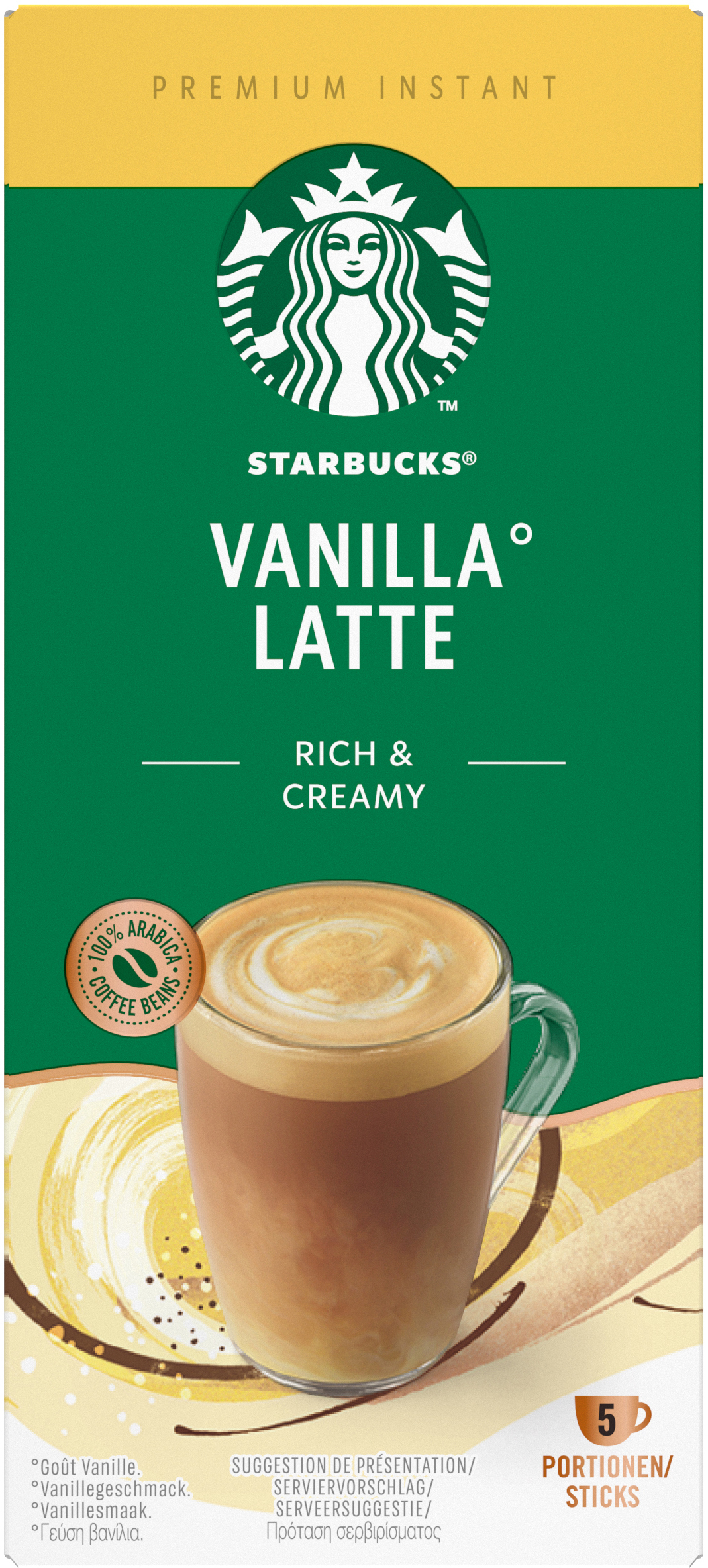 - 1. Gib 1 Einzelportion Starbucks Vanilla Latte in deine Tasse. 2. Mit 180 ml heissem Wasser aufgiessen. Das kochende Wasser 30 Sekunden lang stehenlassen, bevor du es verwendest. Die optimale Temperatur beträgt 85 °C. 3. Umrühren, zurücklehnen und deinen