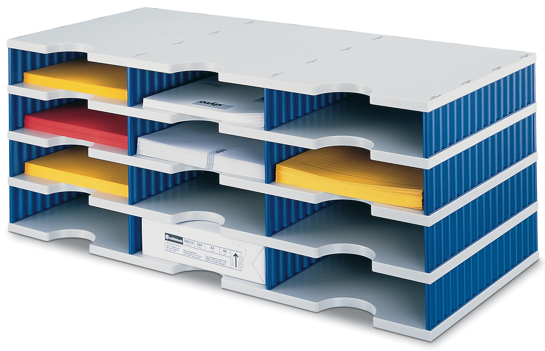 - Platzsparend: Durch die vertikale Anordnung der Fächer wird wertvoller Platz auf dem Schreibtisch gespart.