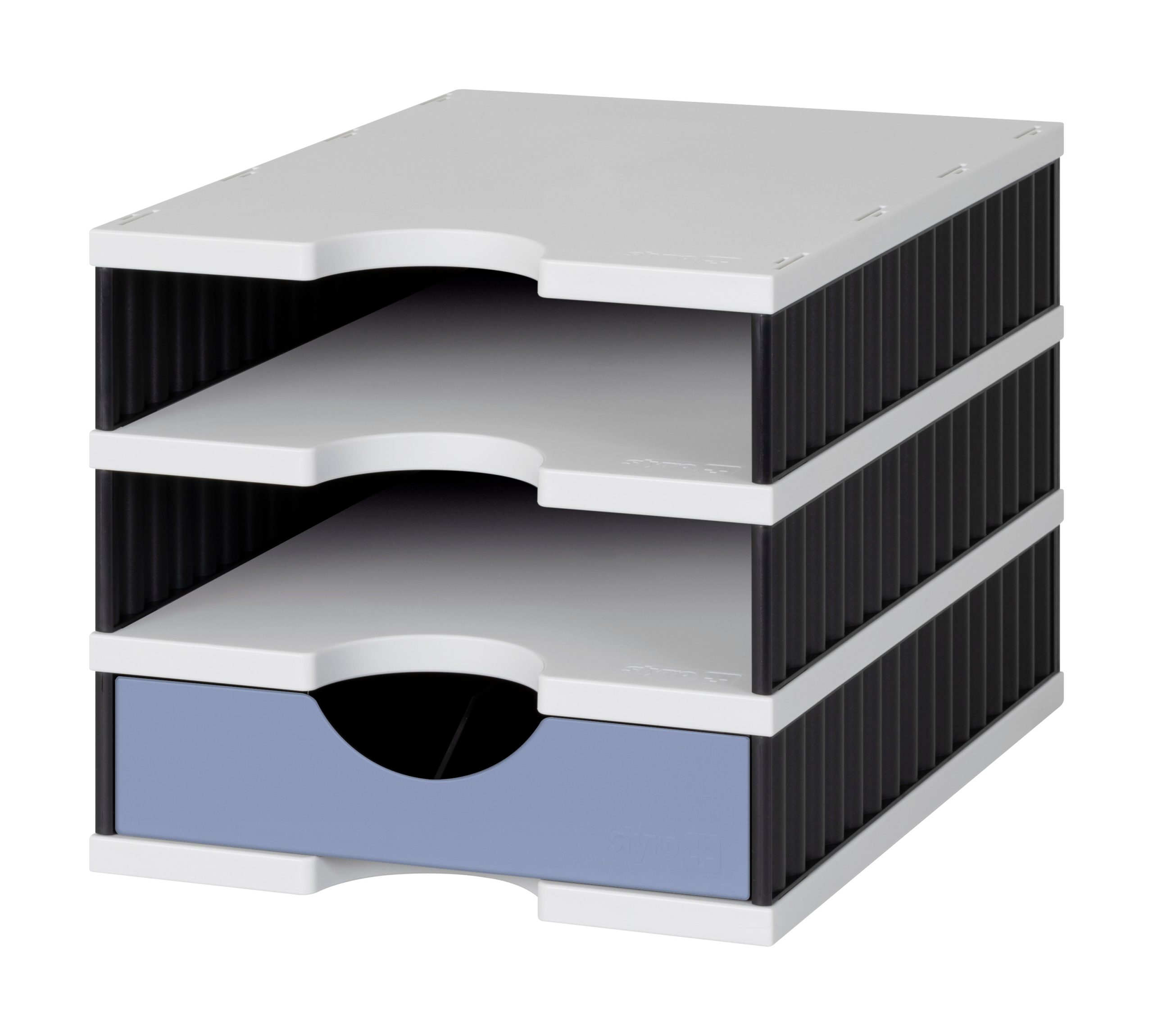 Das Ablagesystem besteht aus hochwertigem, robustem Kunststoff, der nicht nur langlebig, sondern auch leicht zu reinigen ist. Die Oberflächen sind glatt und pflegeleicht, was eine schnelle und unkomplizierte Wartung ermöglicht. Die Kombination aus grau, schwarz und blau verleiht dem styrodoc uno eine moderne und ansprechende Optik, die in jedes Büro oder Homeoffice passt.