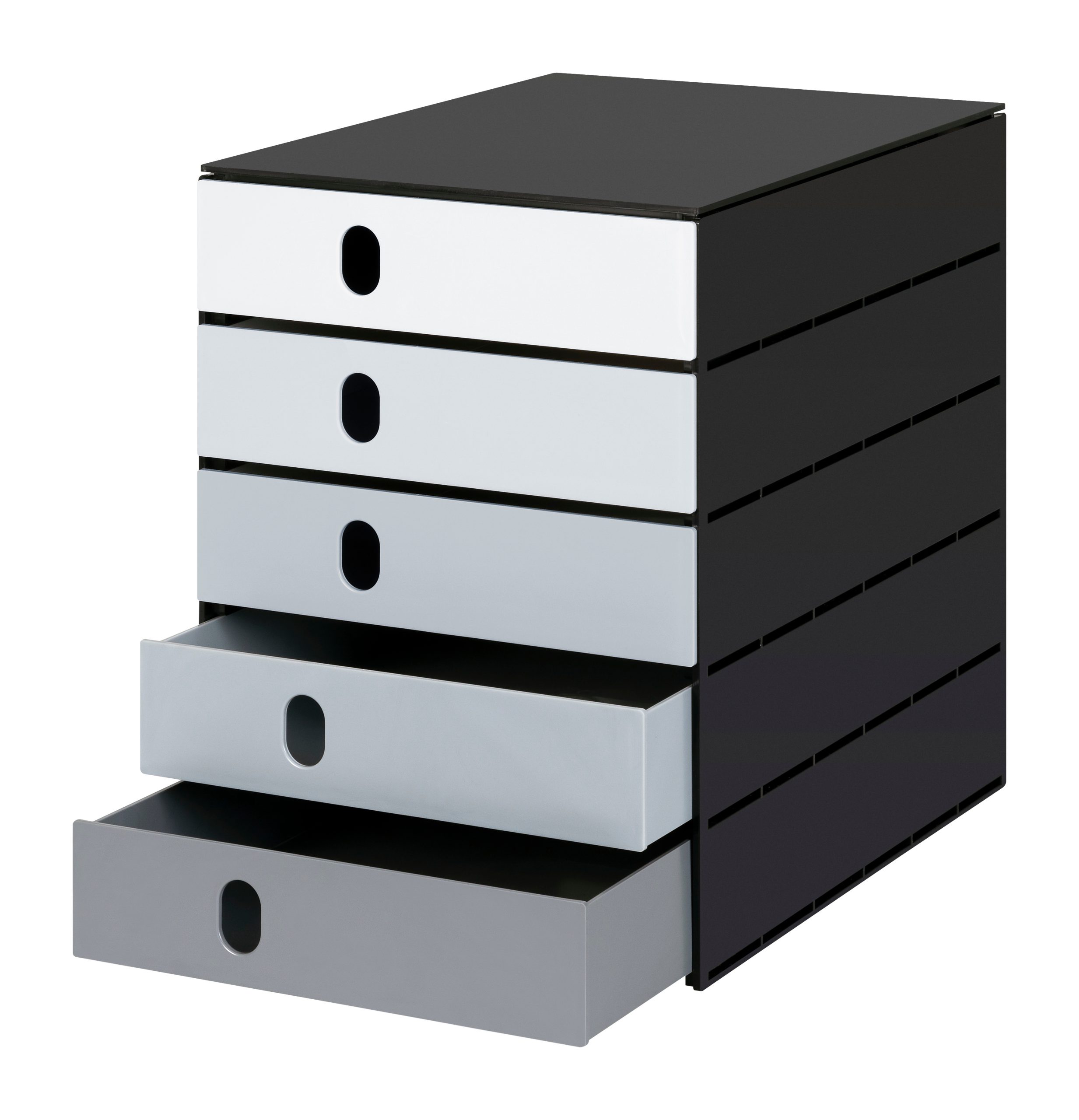 Die STYRO Schubladenbox styroval flow 14-8000.98 in elegantem Schwarz/Grau ist die ideale Lösung zur Aufbewahrung und Organisation Ihrer Büro- oder Wohnaccessoires. Mit fünf geräumigen Schubladen bietet sie ausreichend Platz für verschiedene Utensilien und sorgt damit für Ordnung in Ihrem Arbeitsumfeld oder zu Hause.