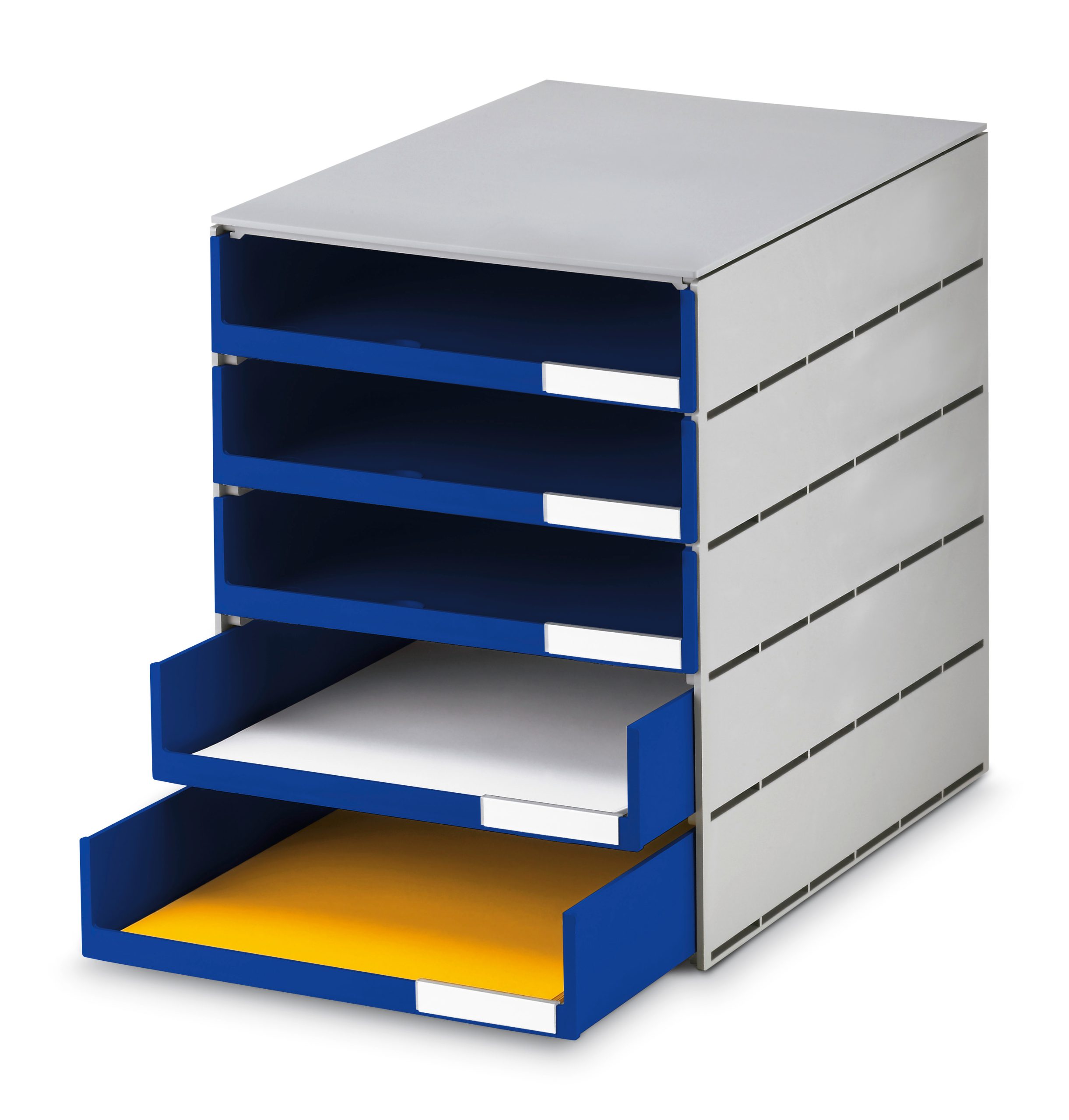 Die STYRO Schubladenbox styroval pro 14-8001.38 in grau/blau bietet fünf offene Schubladen für optimalen Stauraum und Ordnung in jedem Raum. Ideal für Büros und Zuhause!