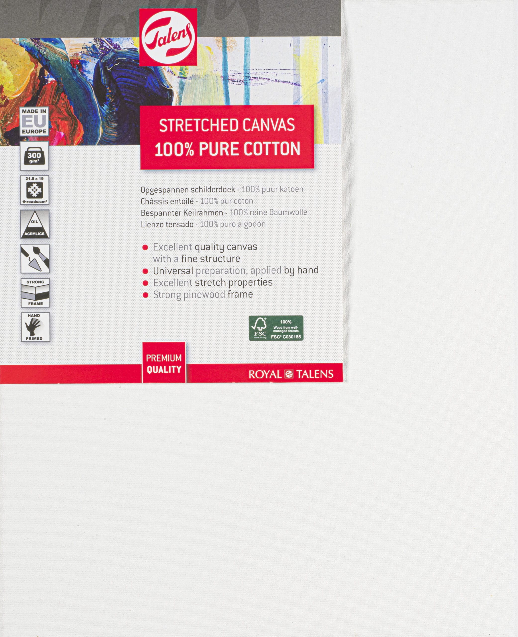 Bespannter Keilrahmen aus Baumwolle – Hochwertige Leinwand von Talens mit feiner Textur (300 g/m², 21,5 x 19 Fäden/cm²). Der Rahmen ist 2 x 3,5 cm dick und aus FSC®-zertifiziertem Holz. Ideal für Öl- und Acrylfarben. Enthält Naturleim-Grundierung und Buchenholzzapfen zum Nachspannen.