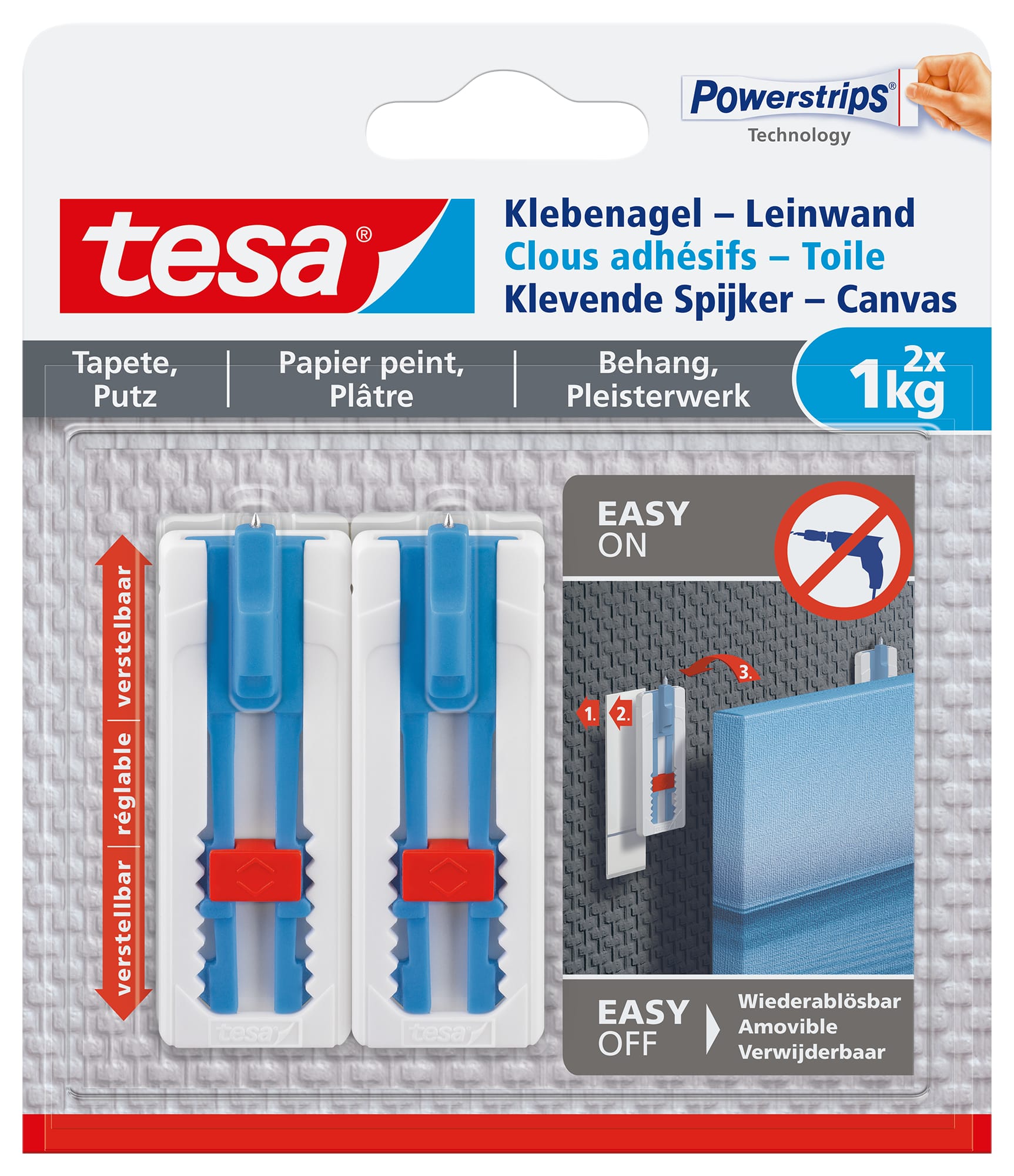 Möchten Sie eine Leinwand oder einen Keilrahmen sicher an Tapeten oder Putz im Innenbereich befestigen? Der tesa® Klebenagel macht es möglich, ohne Hämmern oder Bohren. Einfach an die Wand kleben und dank der tesa Powerstrips® Technologie eine Halteleistung von bis zu 1kg pro Nagel geniessen. Eine Metallspitze sichert die Leinwand zusätzlich, während der verstellbare Nagelkopf es ermöglicht, das Objekt optimal auszurichten und die Höhe jederzeit anzupassen.