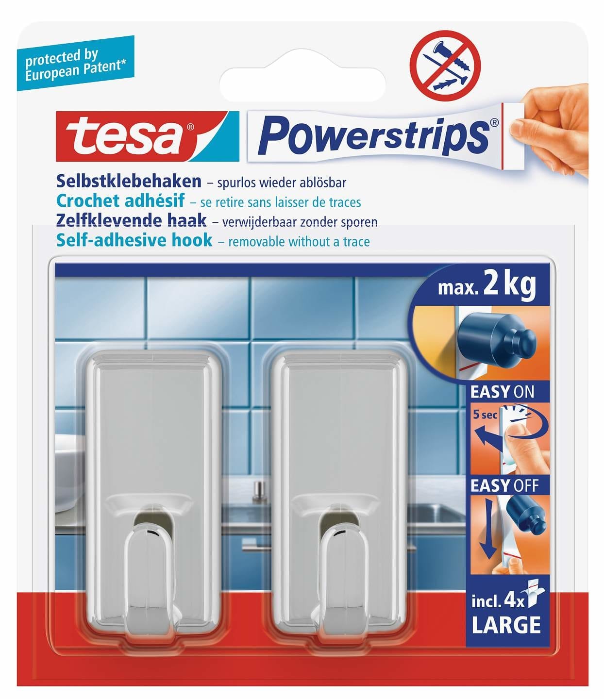 Die POWERSTRIPS – Haken bieten eine praktische Lösung zur Befestigung von Gegenständen bis zu 2 kg Gewicht im Büro oder Haushalt. Der Blister enthält 2 Haken und 4 Powerstrips, die mehrmals verwendet werden können. Diese tesa Powerstrips Haken LARGE überzeugen mit einer starken Halteleistung von bis zu 2 kg und eignen sich somit ideal zum Aufhängen von verschiedenen Gegenständen in Küche, Bad oder auch auf Reisen.