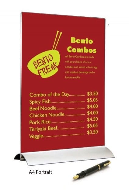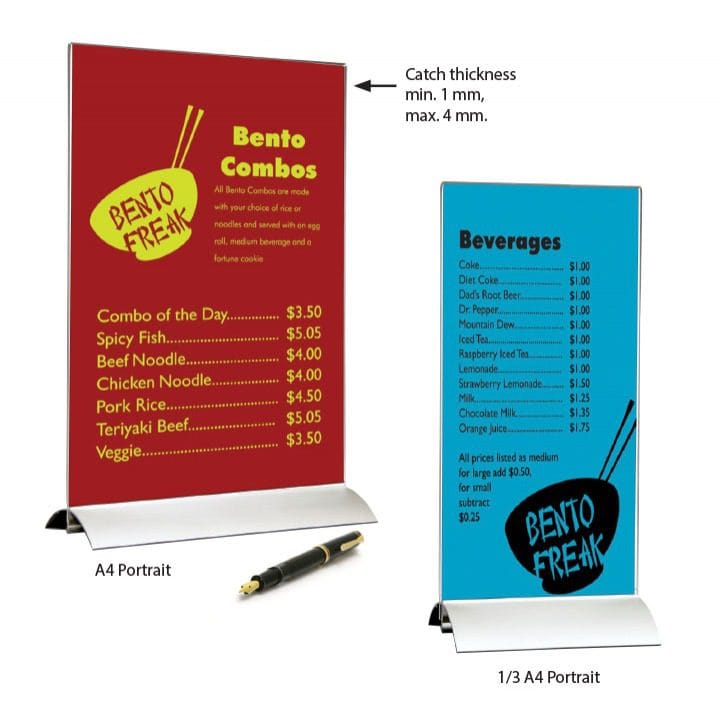 Unser Tischaufsteller aus Aluminium ist die moderne Lösung für Ihre Präsentationsanforderungen. Mit hochwertigem Aluminium gefertigt, bietet dieser Aufsteller eine zeitgemäße und ästhetische Möglichkeit, Speisekarten, Preislisten und andere Inhalte stilvoll zu präsentieren. Die Kombination von Funktionalität und Ästhetik macht diesen Tischaufsteller zu einem echten Blickfang.