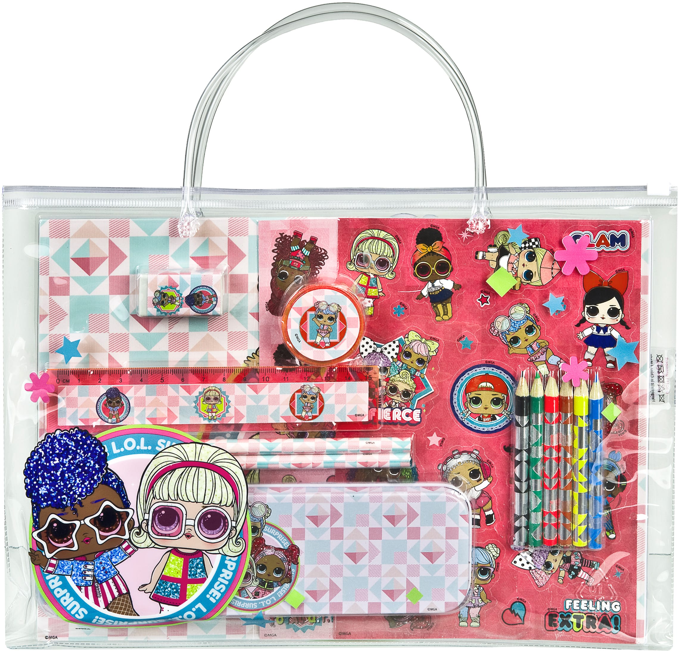 Der Inhalt dieser Tasche lässt keine Wünsche offen: Eine Metalldose, 6 Poster, 2 Stickerblätter, 2 Bleistifte, 5 Mini-Buntstifte, ein Notizblock, ein Lineal, ein Spitzer und ein Radiergummi sind inklusive. Mit dieser vielseitigen Ausstattung können Sie Ihrer Kreativität freien Lauf lassen.