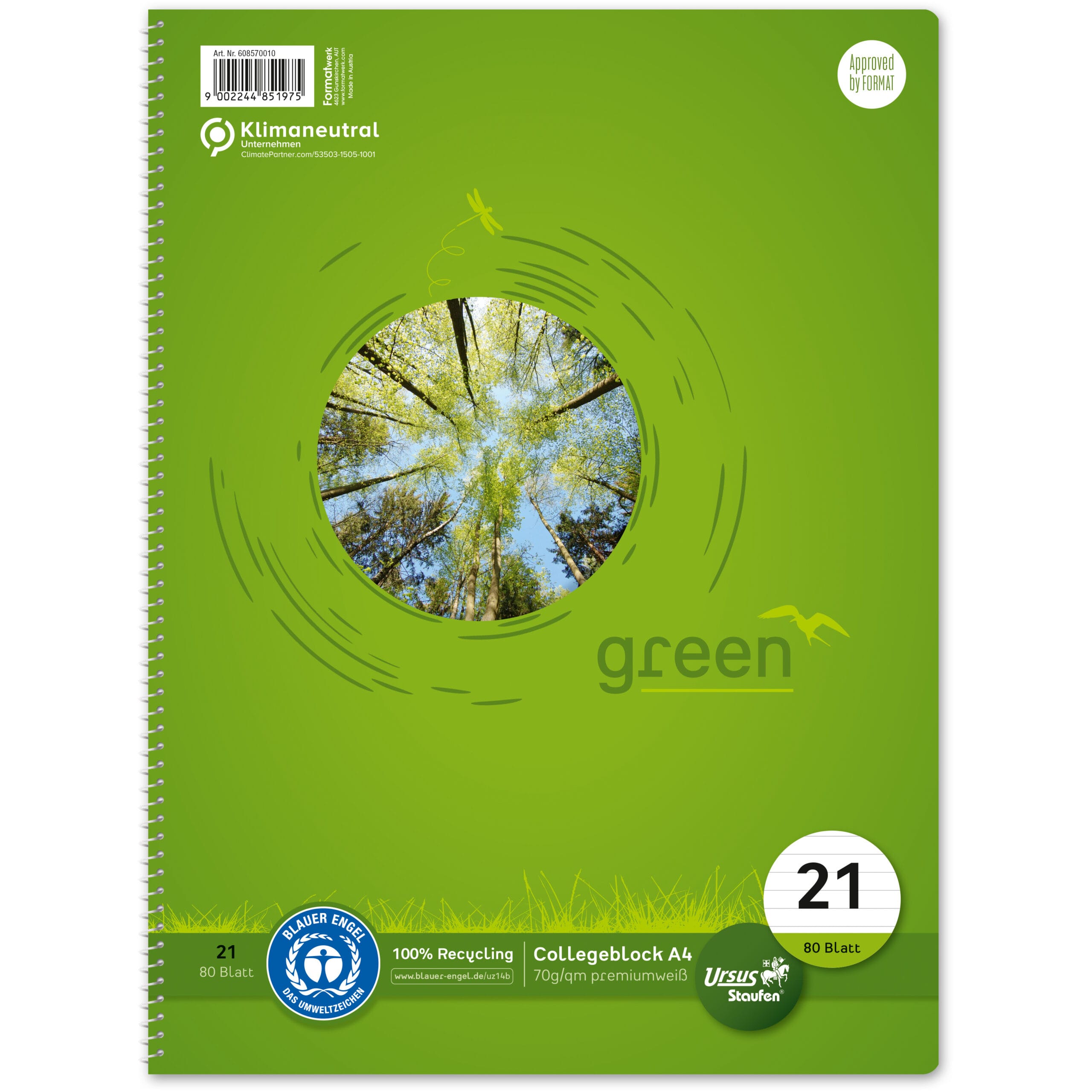 Umweltfreundlicher URSUS GREEN Collegeblock für Schule und Büro