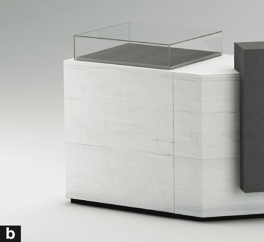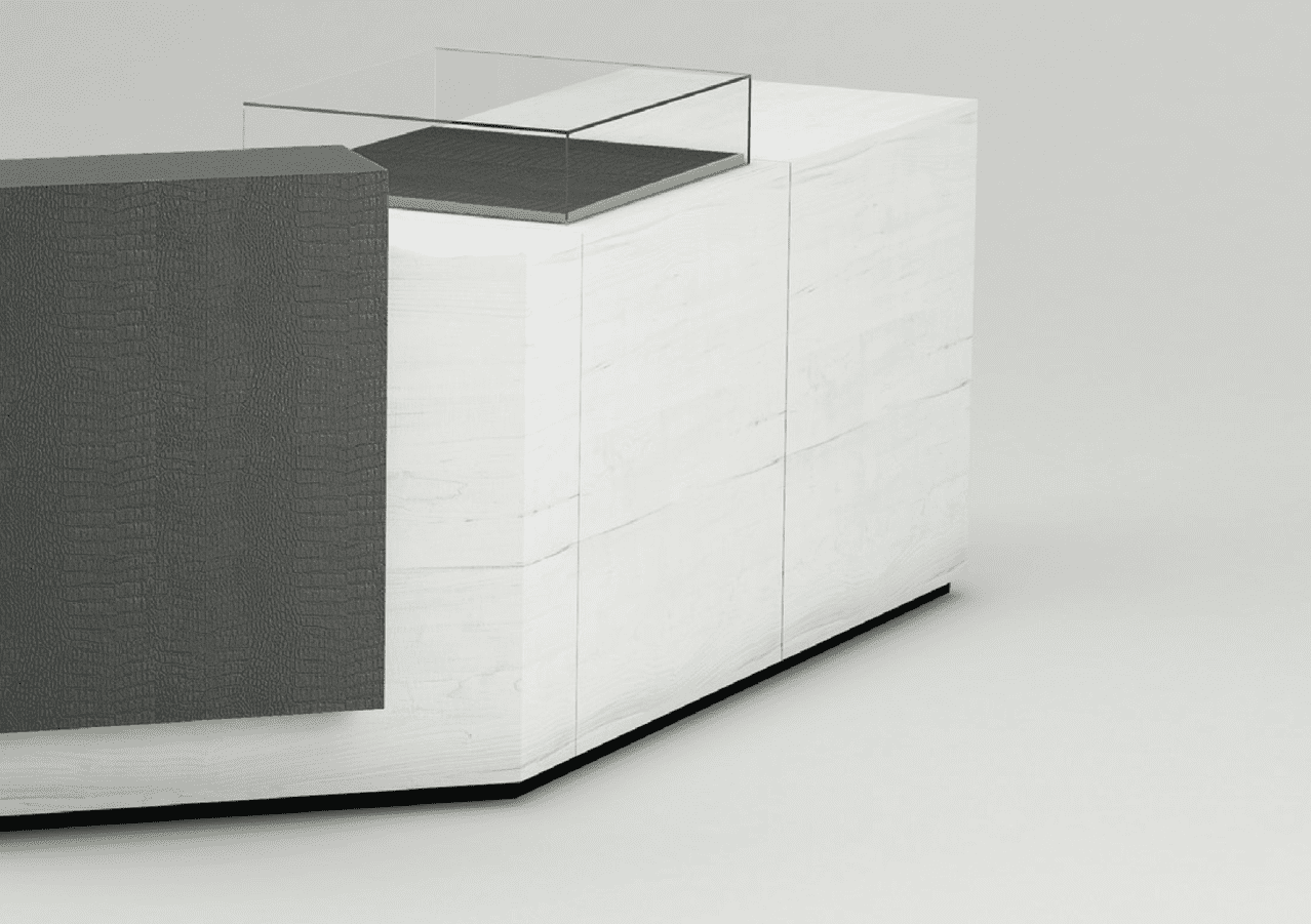 Die Verkaufstheke besticht nicht nur durch ihre hochwertige Verarbeitung, sondern auch durch ihr durchdachtes Design mit Liebe zum Detail. Die weiße Lackierung in Holzoptik harmoniert perfekt mit dem edlen anthrazit Kroko-Leder, welches gedruckt wurde, um eine täuschend echte Optik zu erzeugen.