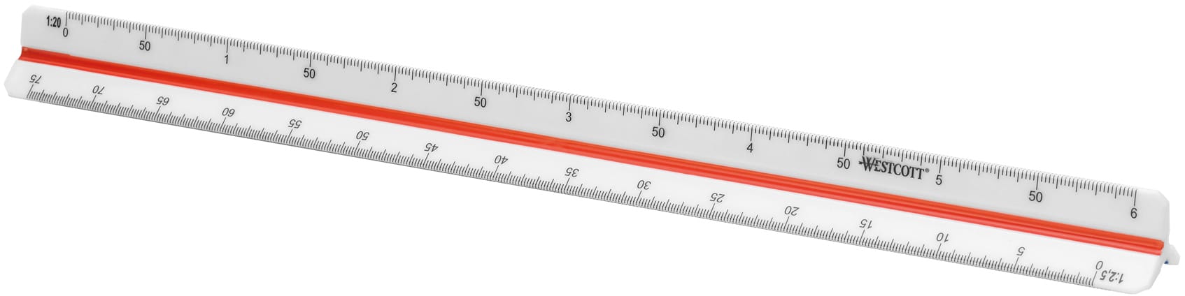 Reduktionsmassstab von WESTCOTT aus hochwertigem Kunststoff für präzise Arbeit. Mit farbigen Hohlkehlen in rot und blau sowie 6 Skalen. Kompakt und genau.