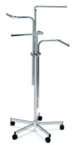 Der höhenverstellbare Abhängeständer mit 4 geraden Armen bietet eine vielseitige Möglichkeit, Ihre Kleidungsstücke in einer eleganten und praktischen Art und Weise zu präsentieren. Mit seinen geraden Armen, der praktischen Höhenverstellbarkeit durch Schlauchklemmen, den Rollen und der verchromten Oberfläche stellt dieser Ständer eine flexible Lösung dar, um Ihre Modekollektion stilvoll zur Schau zu stellen.