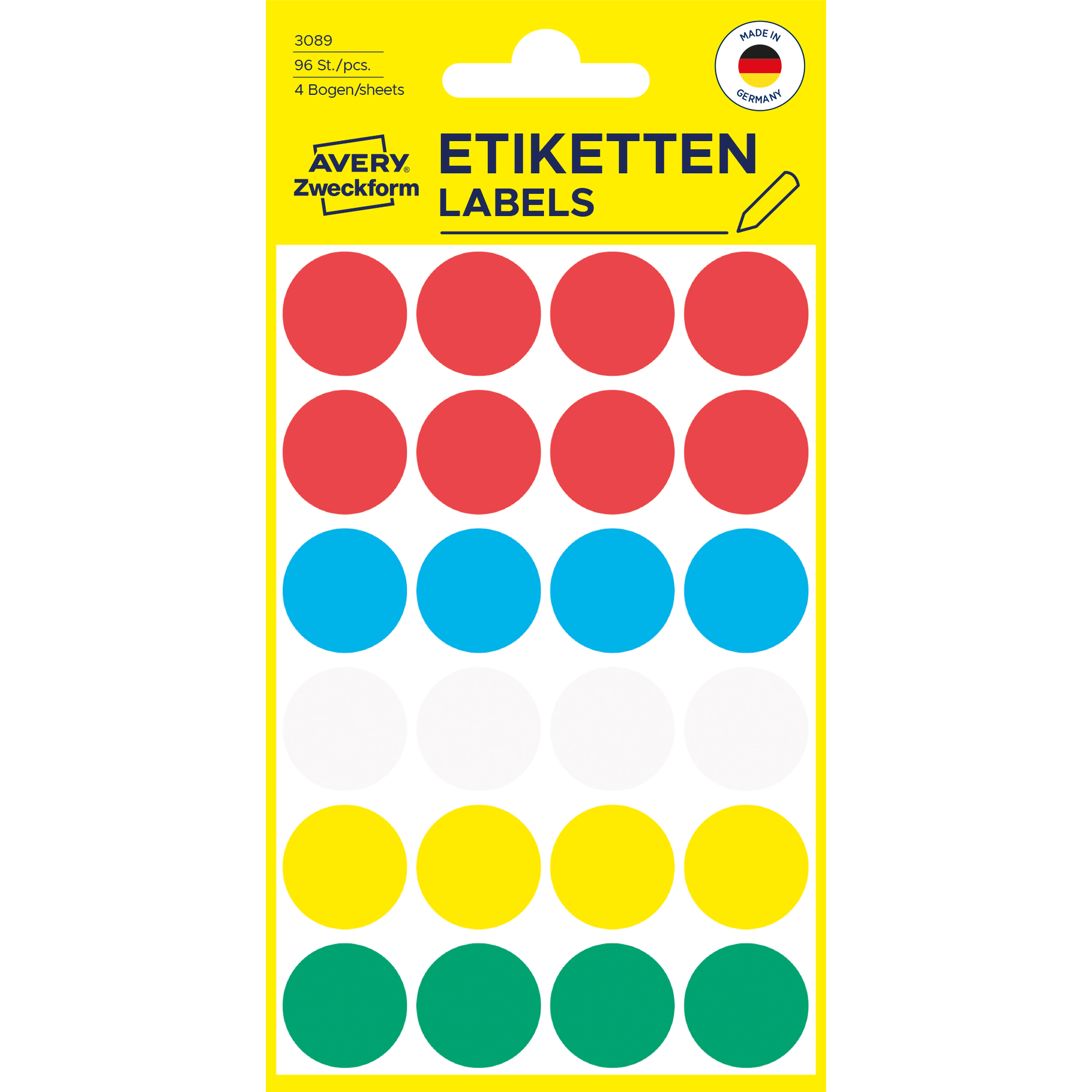 Die AVERY ZWECKFORM Markierungspunkte 18mm 3089 in assortierten Farben sind ideal zum Kennzeichnen und Organisieren. 96 Stück pro Packung bieten vielseitige Anwendungsmöglichkeiten