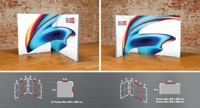 Entdecken Sie die vielfältigen Varianten der räumlichen Gestaltung mit BIG UP. Als Einzelsystem beeindruckt BIG UP bereits, doch in Kombination mit mehreren Systemen ist es unschlagbar. Kombinieren Sie mehrere Displays und erschaffen Sie lange Wände, L- oder U-Formen. Beeindrucken Sie Ihre Kunden mit neuen Eindrücken. Schon mit nur zwei Startermodulen und zwei Erweiterungssets haben Sie zahlreiche Möglichkeiten der räumlichen Gestaltung. Beide Höhenvarianten von 2,5 und 3 Metern können auch auf 2 Meter reduziert werden.