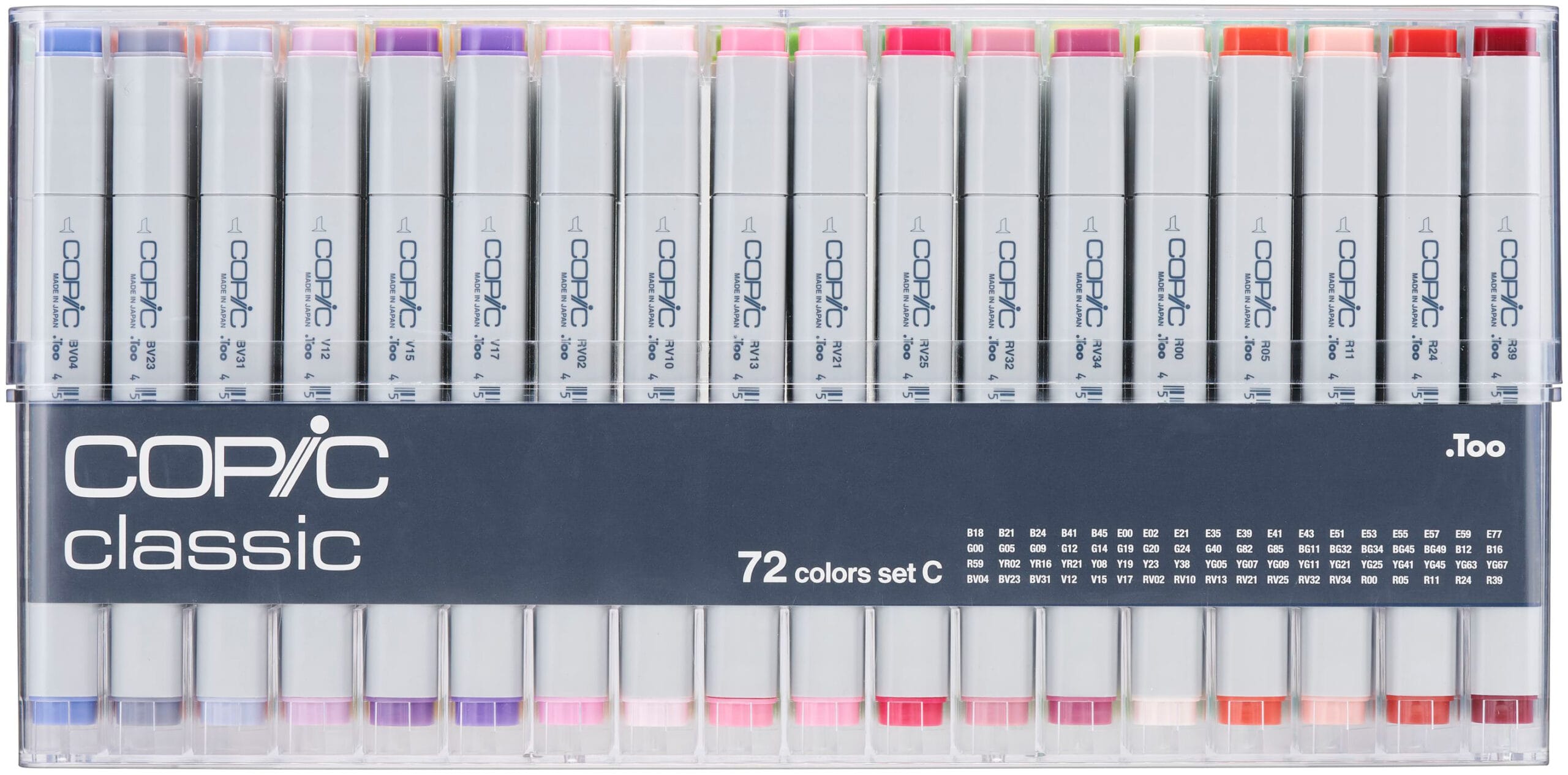 Das Classic Set C mit 72 Grafikmarkern bietet eine breite Palette an hellen und neutralen Farben, die speziell für fortgeschrittene grafische Markertechniken und erfahrene Nutzer entwickelt wurden. Die Zusammenstellung ergänzt perfekt die 214 Farben des Copic Classic-Sortiments, wenn die Sets A, B und C kombiniert werden (Hinweis: Nur die Farben 100 & 110 wären dupliziert).