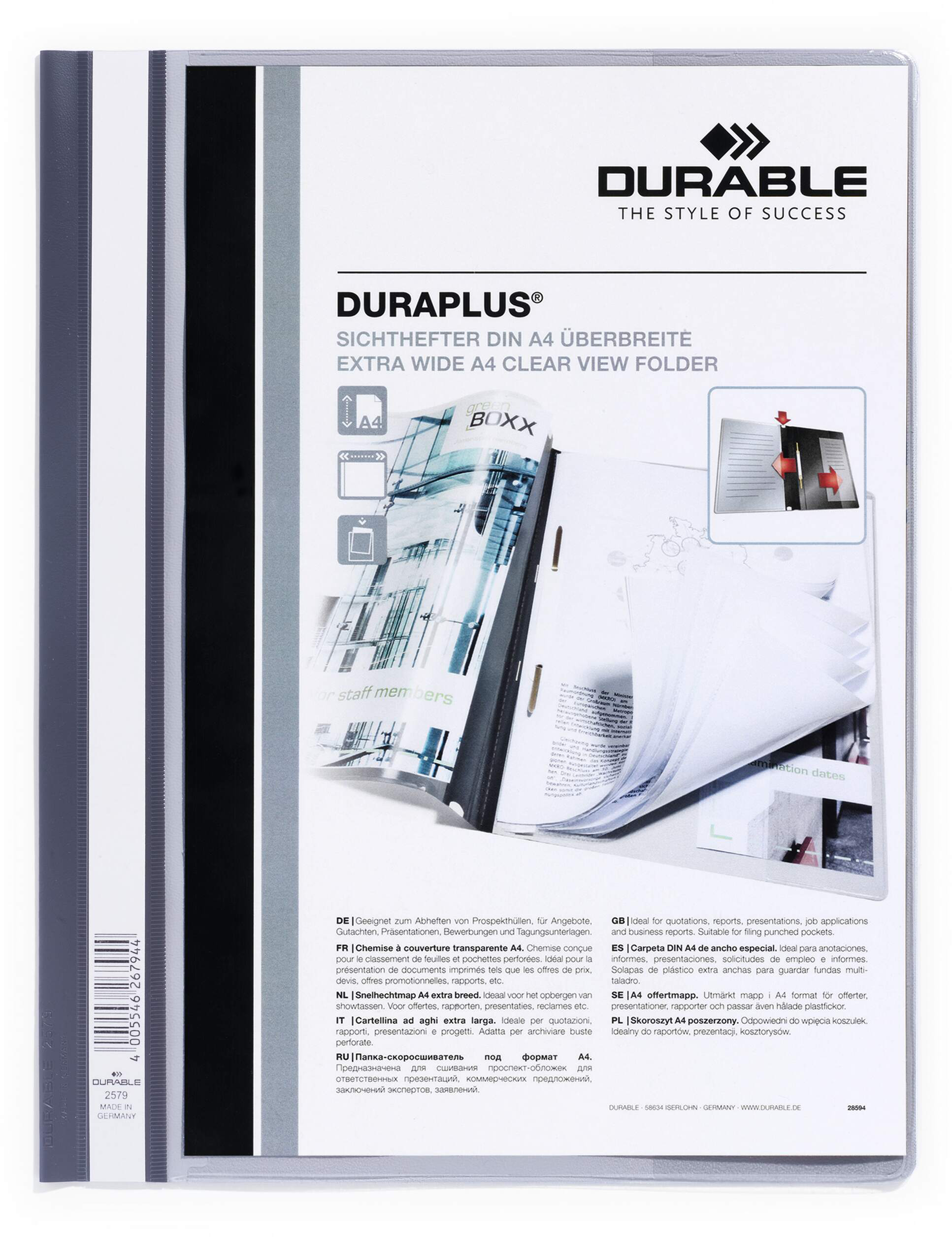 Der DURABLE Angebotshefter ist mit allen Standard-A4-Dokumenten kompatibel, was ihn zu einer flexiblen Wahl für unterschiedlichste Anwendungen macht. Egal, ob Sie lose Blätter, gedruckte Präsentationen oder wichtige Verträge abheften möchten – der DURAPLUS 257910 bietet die passende Lösung. Zudem lässt sich der Heftsystem problemlos in Aktenordnern oder Aktenschränken verstauen, wodurch eine einfache Organisation und Zugänglichkeit gewährleistet ist.