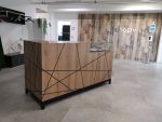 Die Rückseite des Empfangstresens ist mit mattem Schwarz lackiertem MDF versehen. Dieser Kontrast zur Eichenoptik verleiht dem Tresen eine ausgewogene Gesamterscheinung und lässt ihn stilvoll wirken.