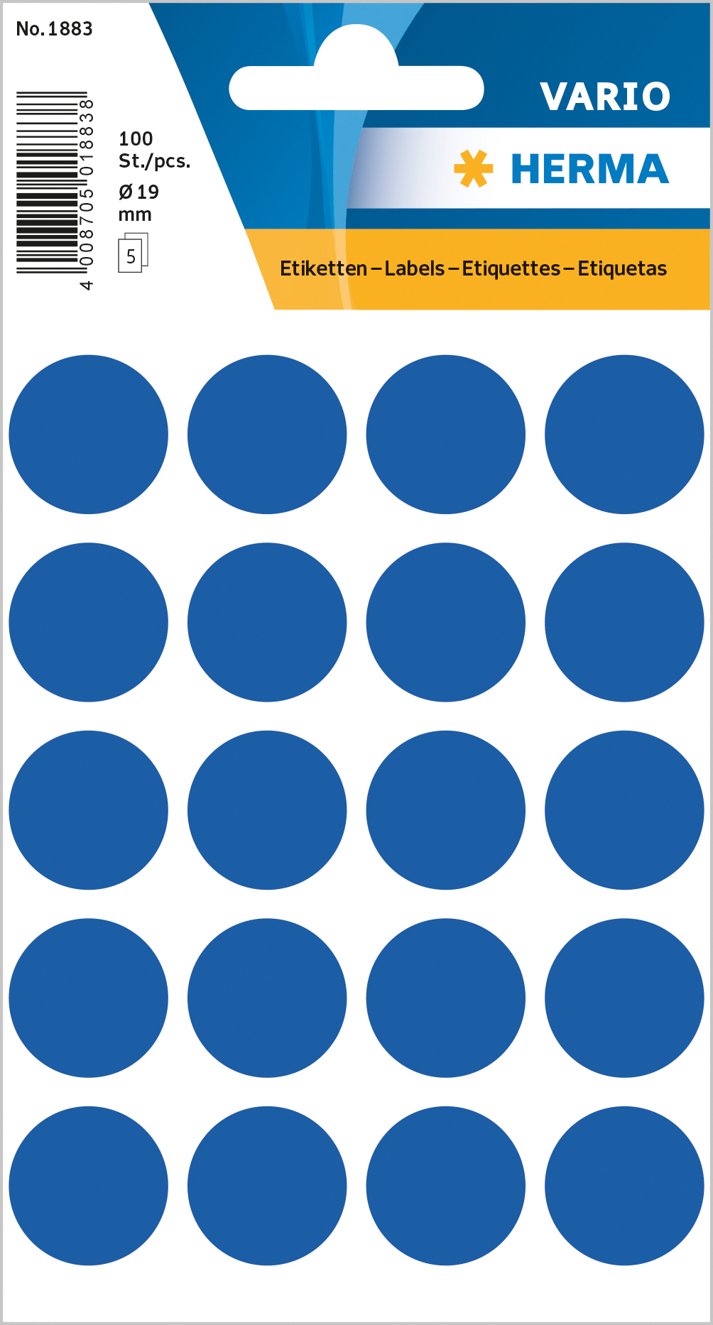 Die HERMA Etiketten rund in der Grösse von 19 mm (Artikelnummer 1883) sind die ideale Lösung für all Ihre Beschriftungsbedürfnisse. Mit ihrer ansprechenden dunkelblauen Farbe bieten diese Etiketten nicht nur eine praktische Funktion, sondern auch eine elegante Optik. Jedes Set enthält 100 hochwertige Etiketten, die sich vielseitig einsetzen lassen.