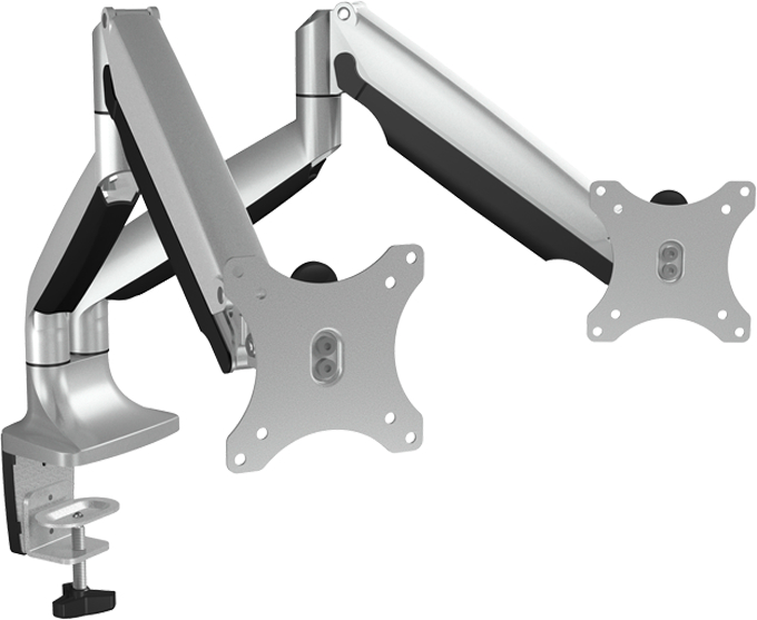 Der ICY BOX Monitorständer IB-MS504-T bietet Platz für zwei 32-Zoll-Monitore und sorgt für eine ergonomische Arbeitsplatzgestaltung in stilvollem Silber-Schwarz.